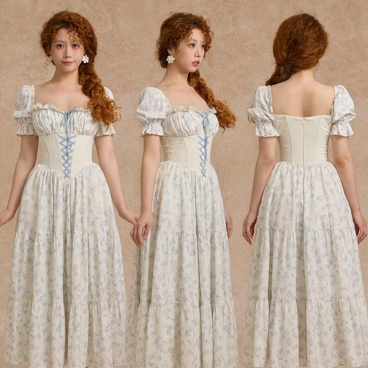 甜美公主裙蓝色碎花鱼骨收腰通勤连衣裙长款 法式 蓝娃娃 LaceMade