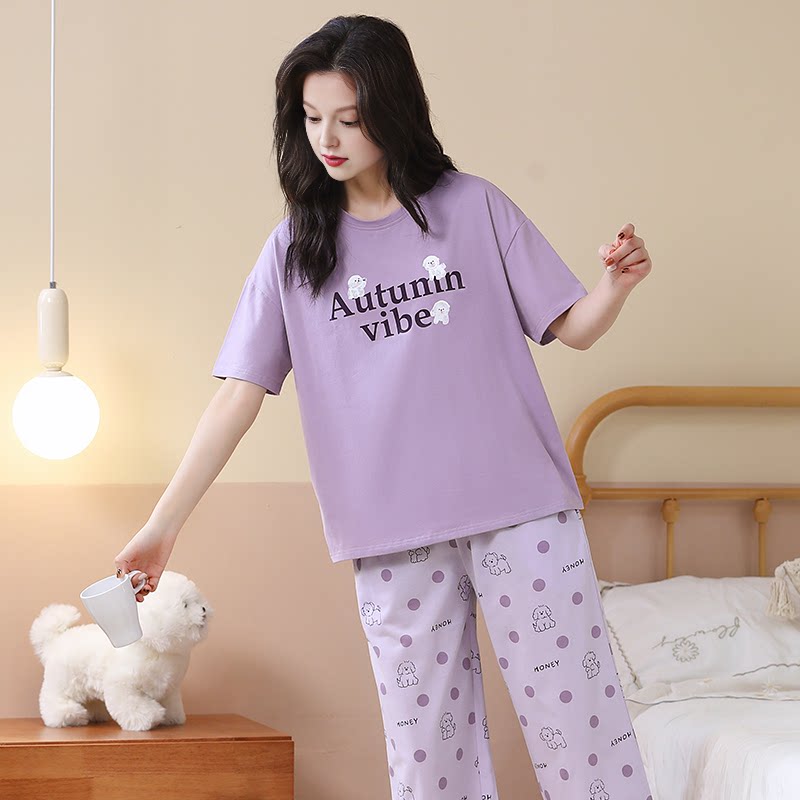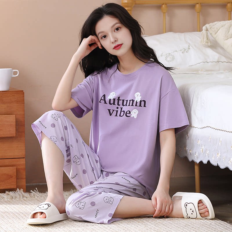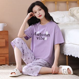 纯棉薄款 女款 短袖 套装 全棉可爱休闲家居服 七分裤 芬腾女士睡衣夏季