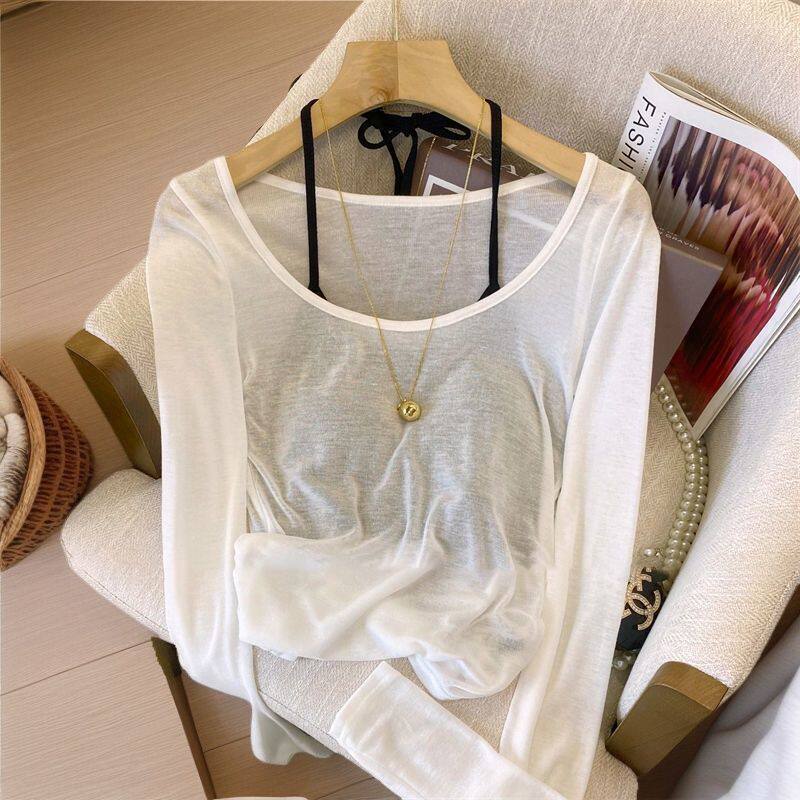 辣妹春夏款 吊带薄款 套装 长袖 背心两件套 镂空抽褶防晒针织罩衫 美式