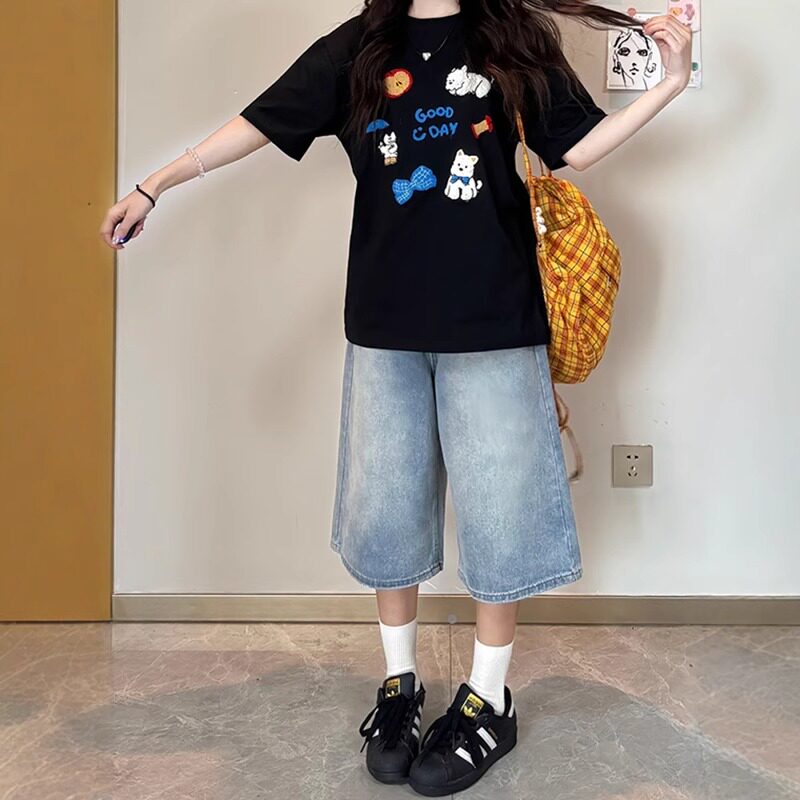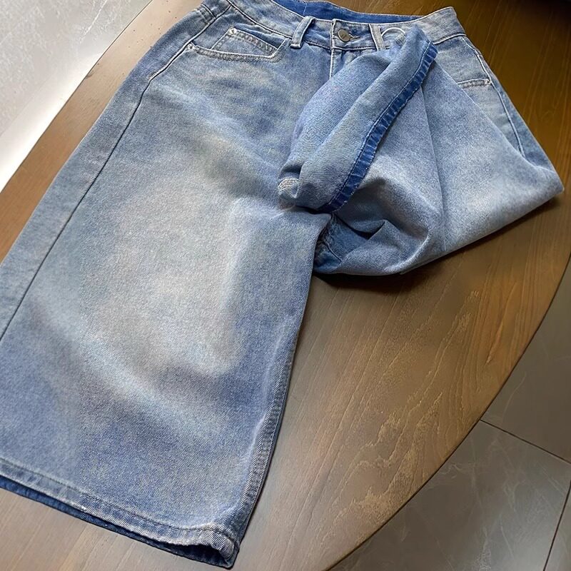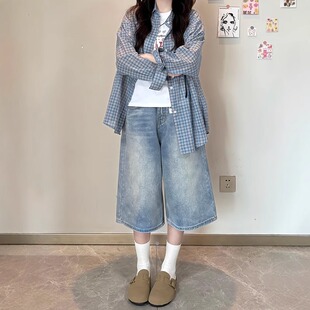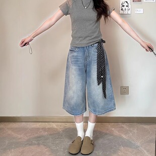 显瘦阔腿七分牛仔裤 浅色百搭直筒牛仔中裤 高腰宽松大码 薄款 女夏季