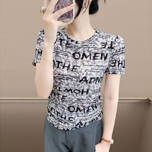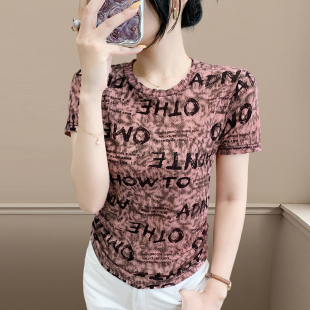 半袖 圆领网纱印花上衣女士短袖 洋气蕾丝小衫 2026新款 纱衣 T恤夏季