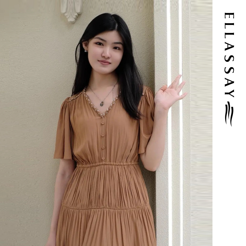 ELLASSAY歌力思秋冬新款 收腰V领多层褶连衣裙女EWW355Y13000 法式