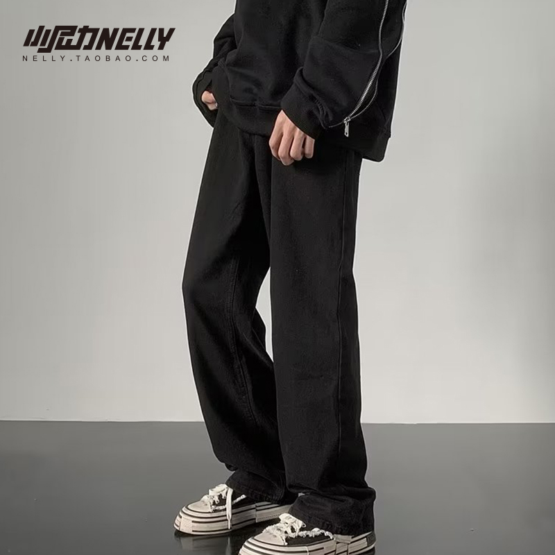 直筒复古重磅休闲裤 黑色牛仔裤 秋季 高街潮牌宽松阔腿长裤 子 男美式