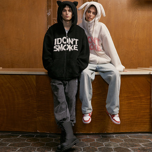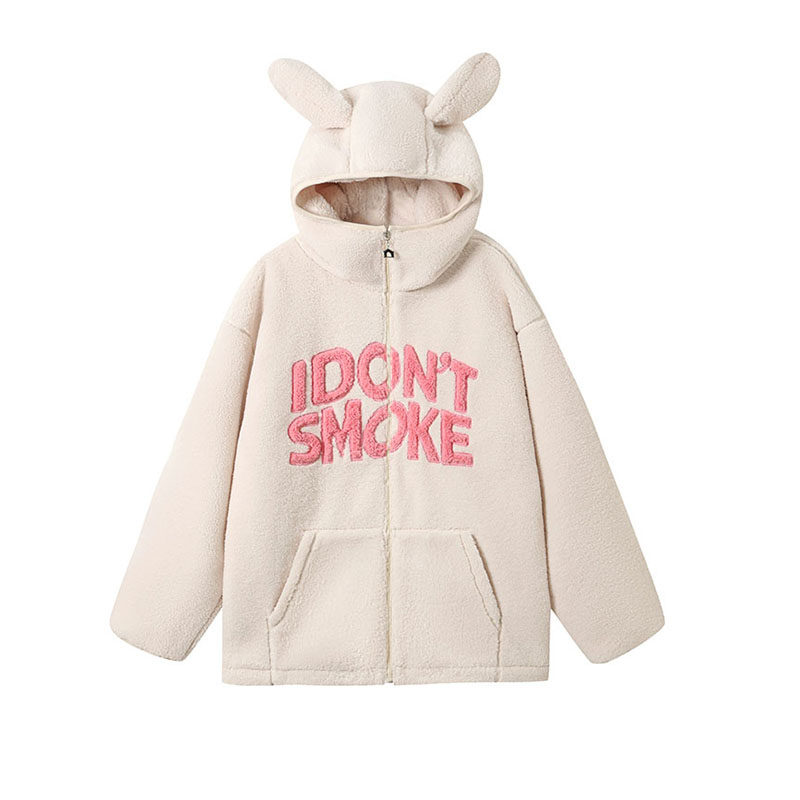 DONSMOKE美式 立体玩偶耳朵 小熊兔子连帽羊羔毛绒外套 任敏同款