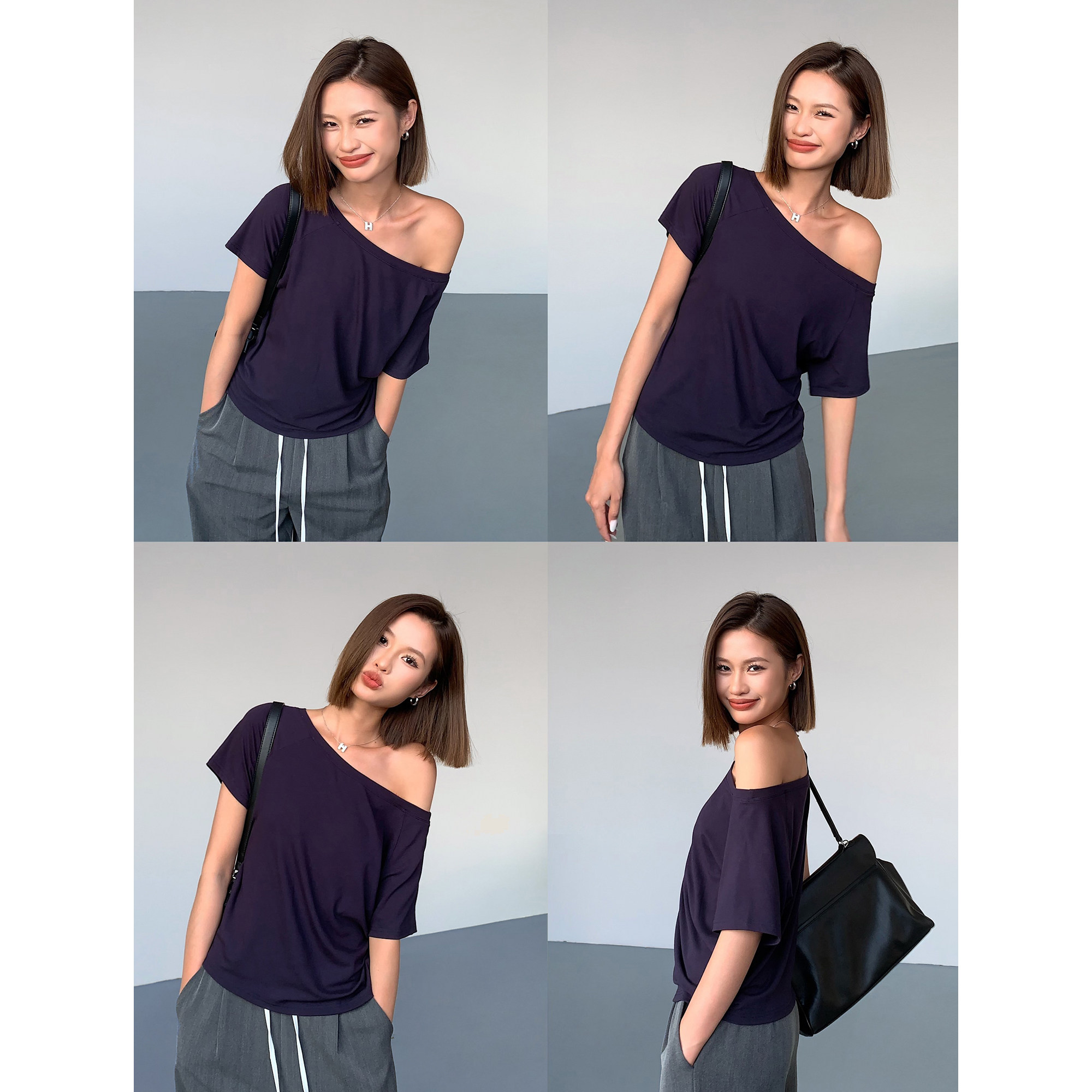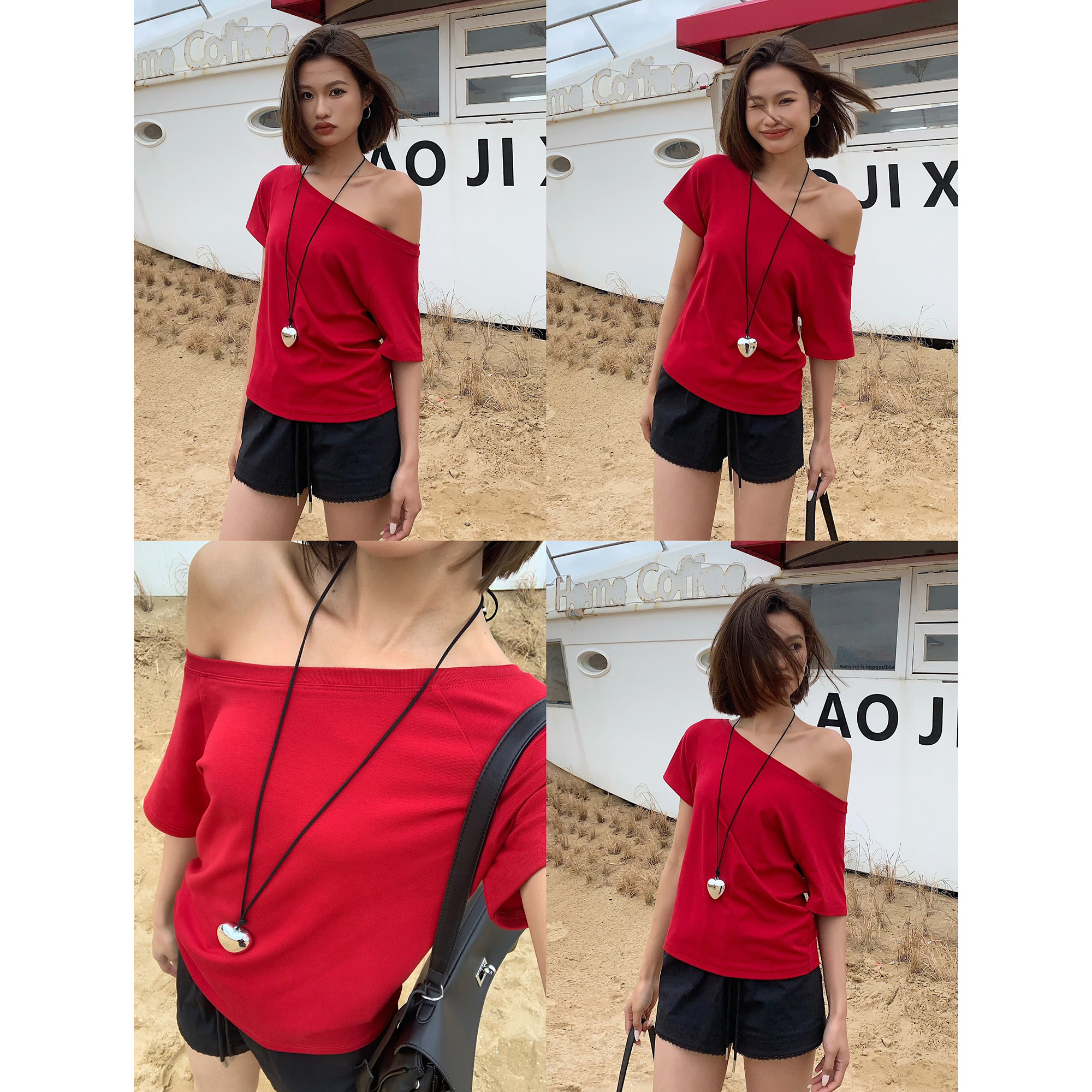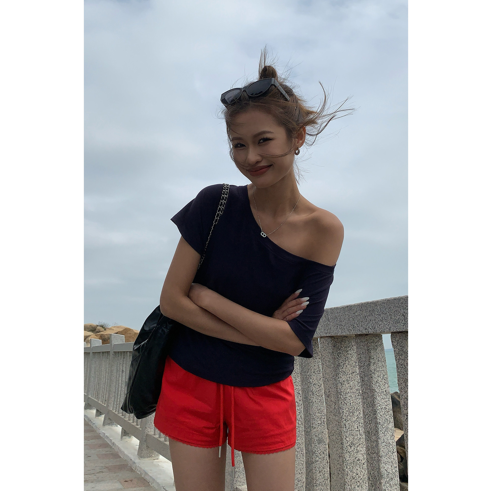 t恤女宽松慵懒红气质深蓝上衣 针织白色斜肩短袖 ousph 现货4折