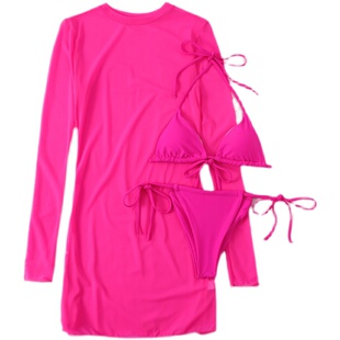 2022新款 防晒荧光色纯色素色比基尼三件套 外贸网纱透视性感长袖
