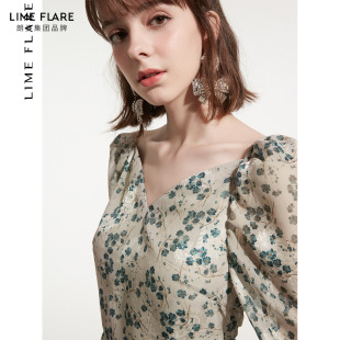 莱茵福莱尔收腰中袖 连衣裙垂感提花雪纺裙初秋v领碎花裙