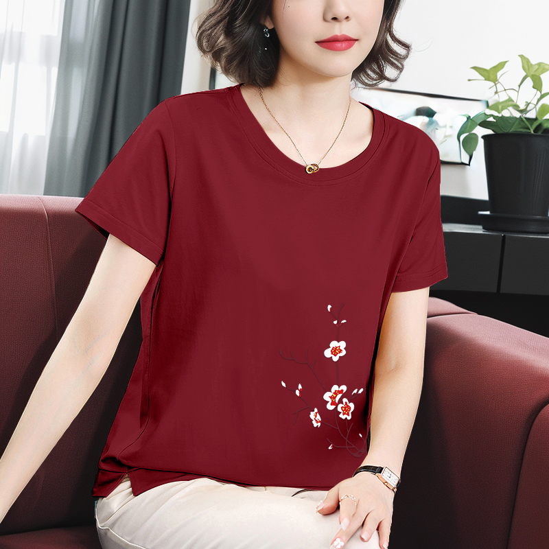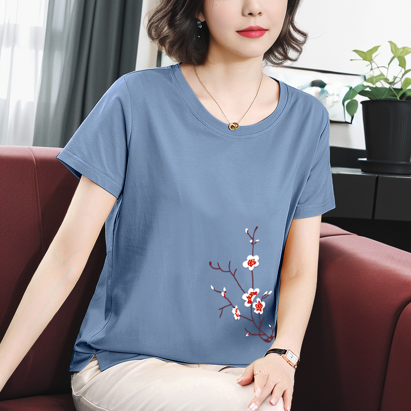 国风中年妇女气质夏装 新款 全棉 t恤女士上衣宽松大码 妈妈纯棉短袖