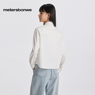 百搭长袖 美特斯邦威飘带衬衫 白色短款 新款 宽松学院上衣女 女春季