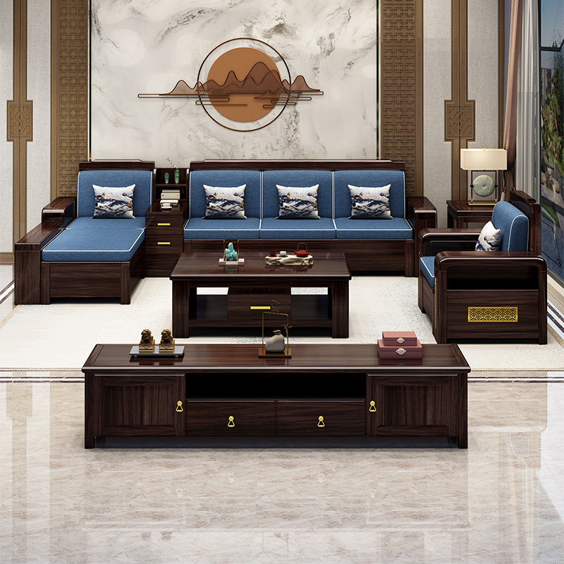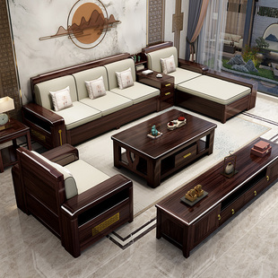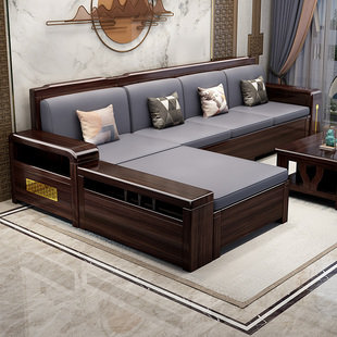 新中式 胡桃木实木沙发组合冬夏两用现代大小户型客厅转角储物沙发