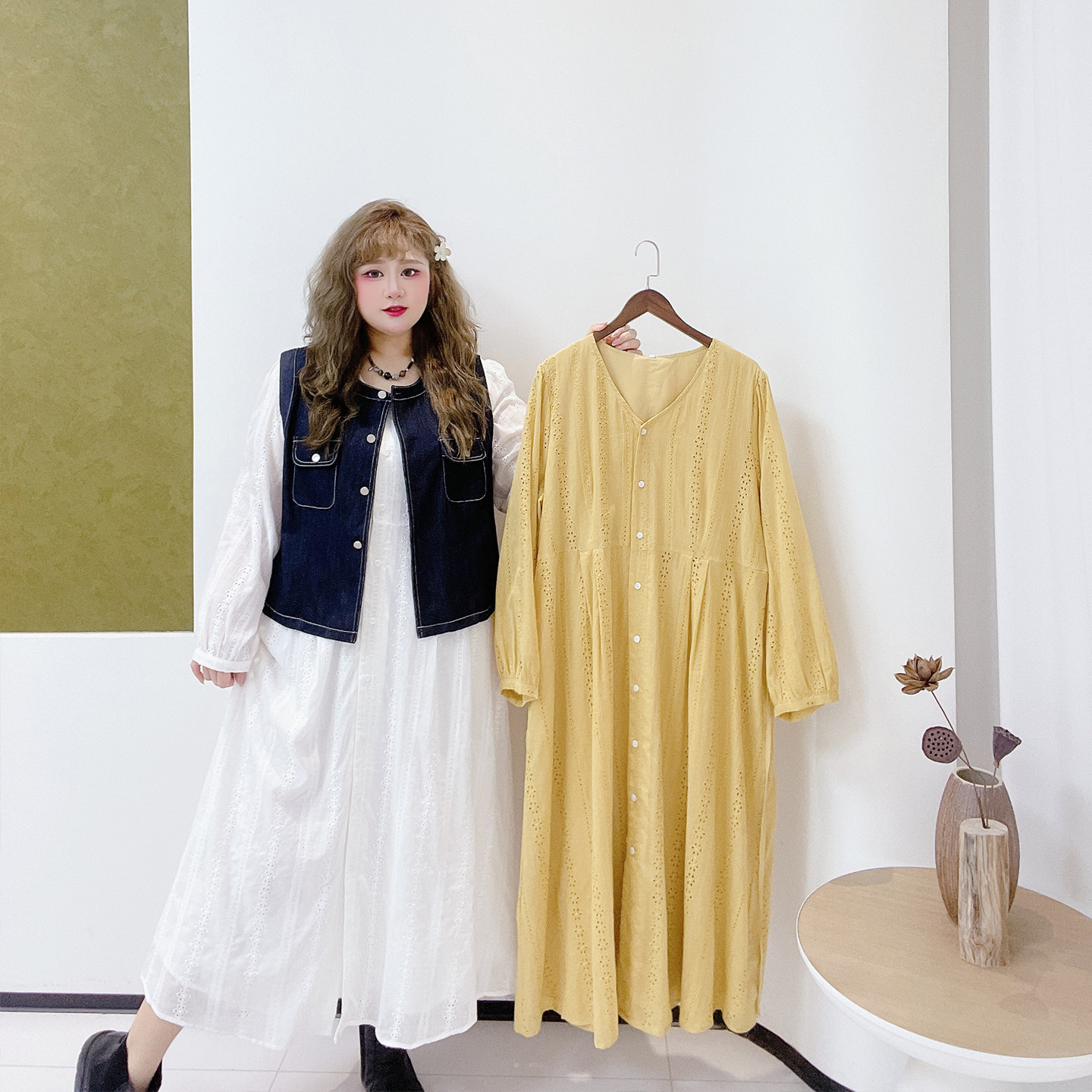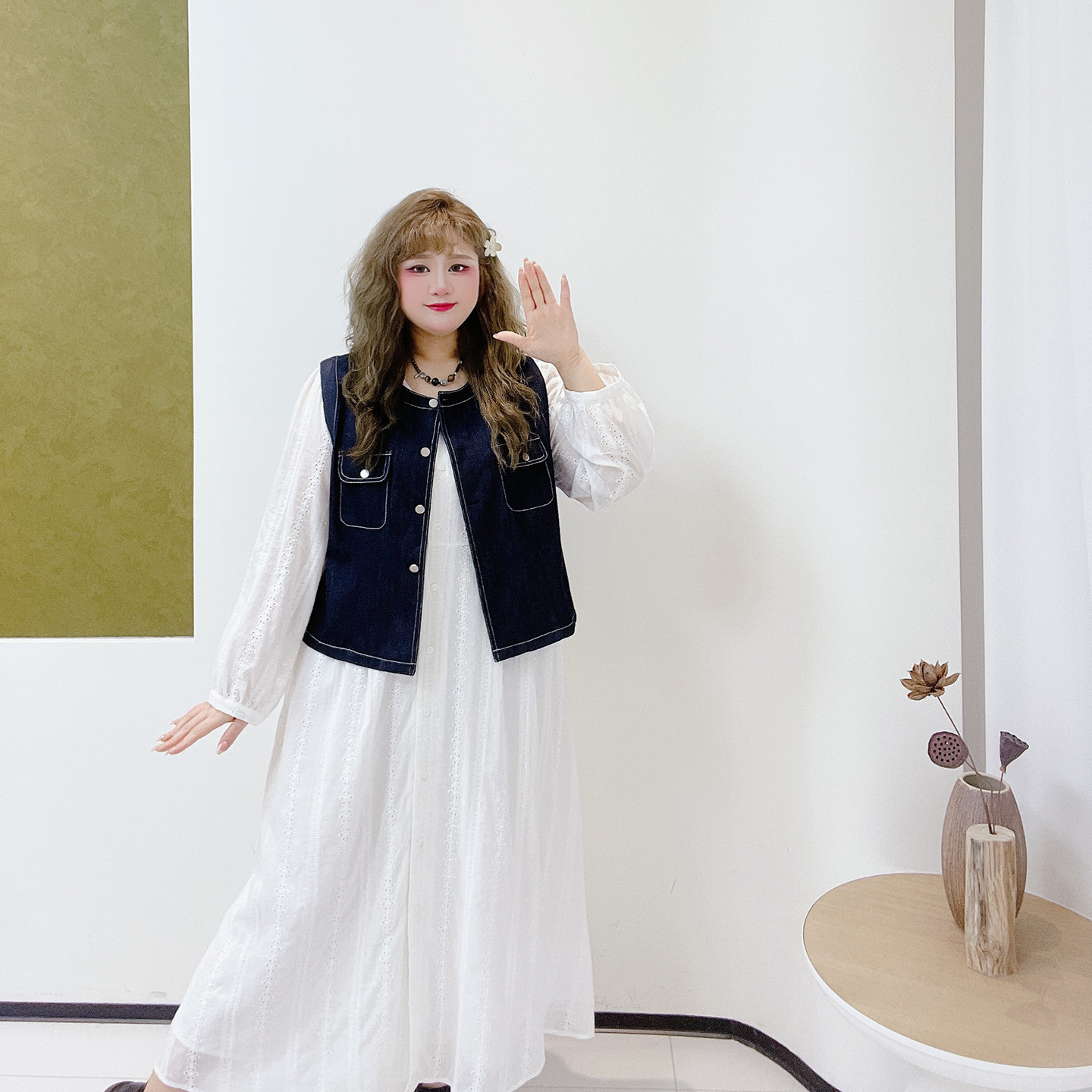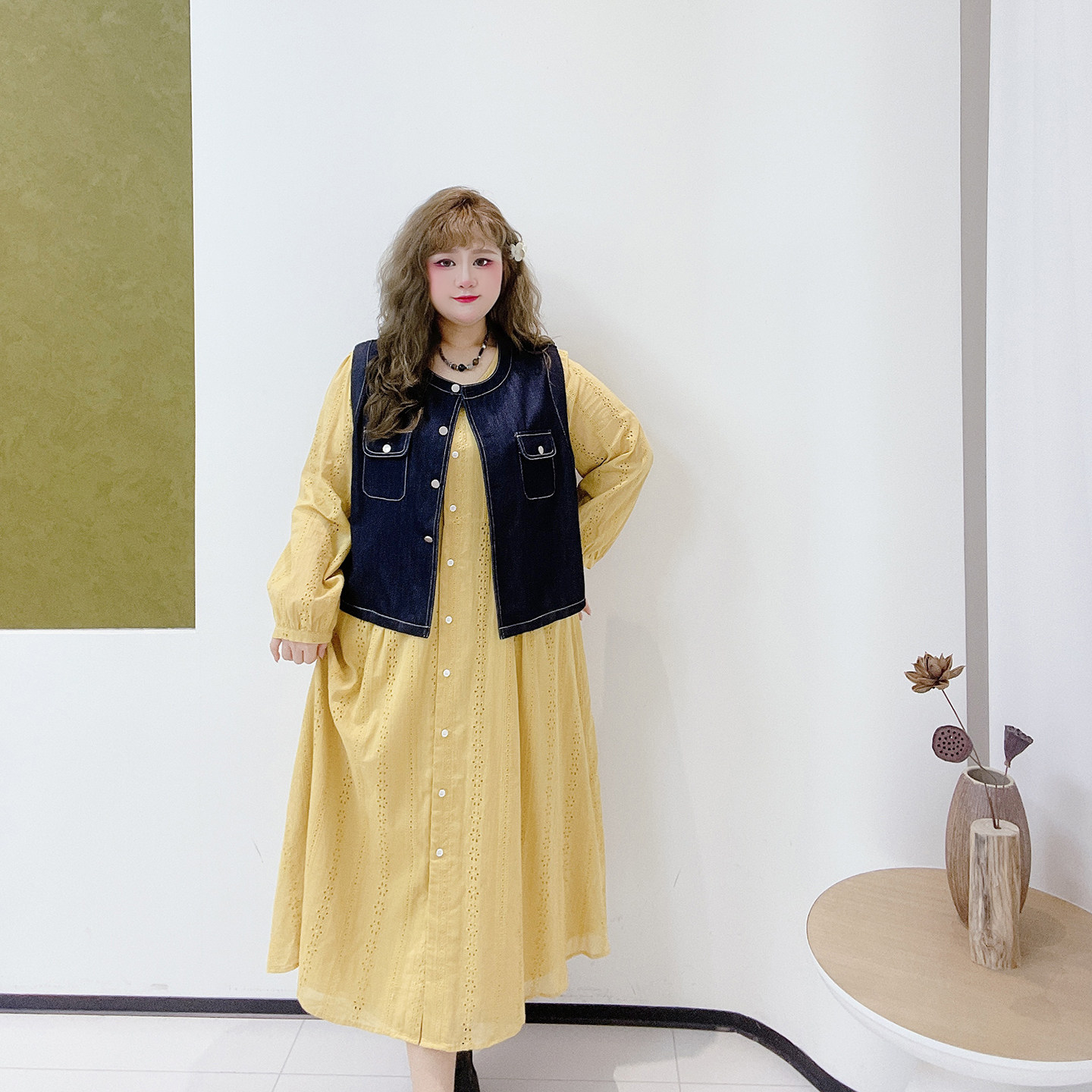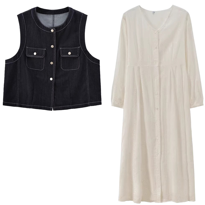 文艺复古风新书卷系显瘦牛仔马甲连衣裙套装 2026春胖莹莹大码 女装