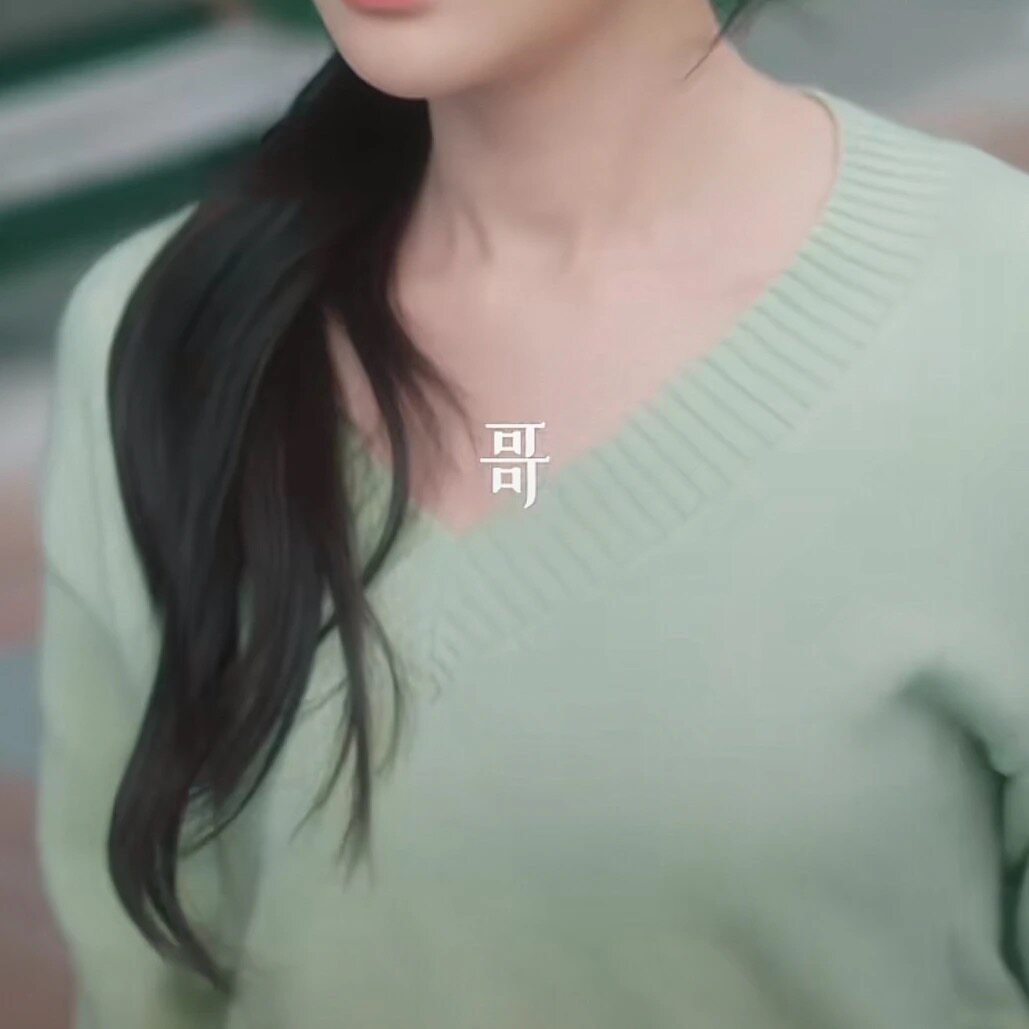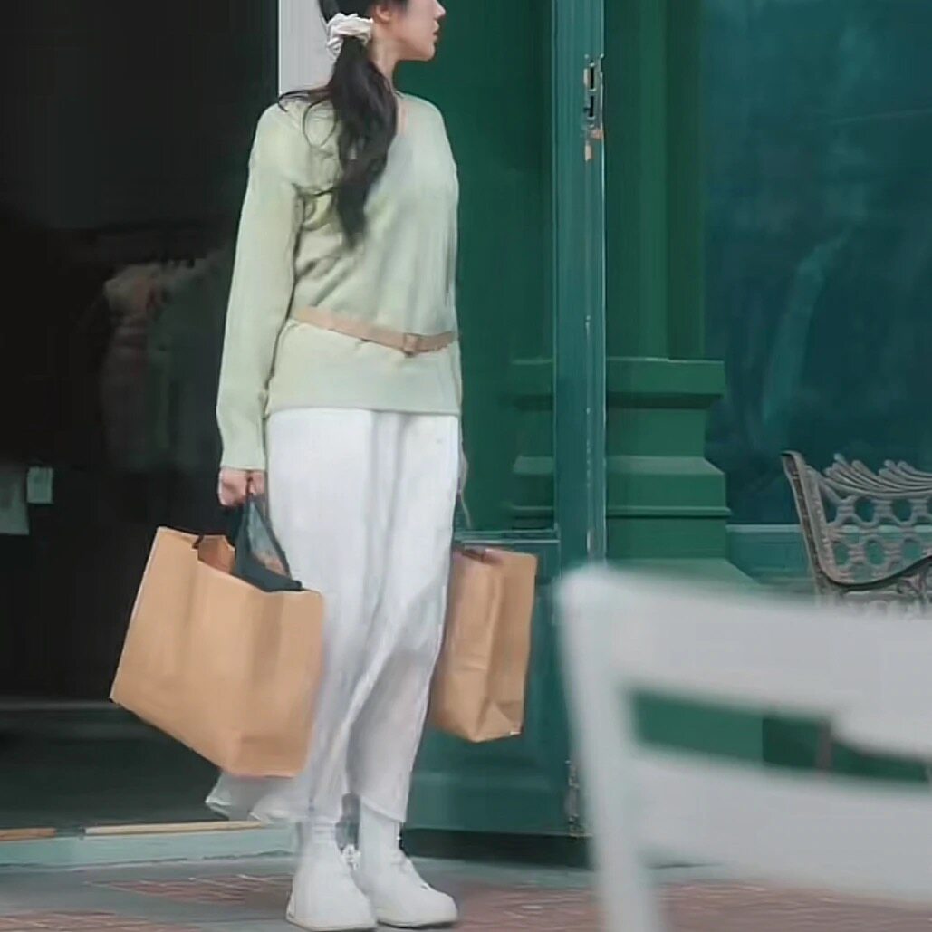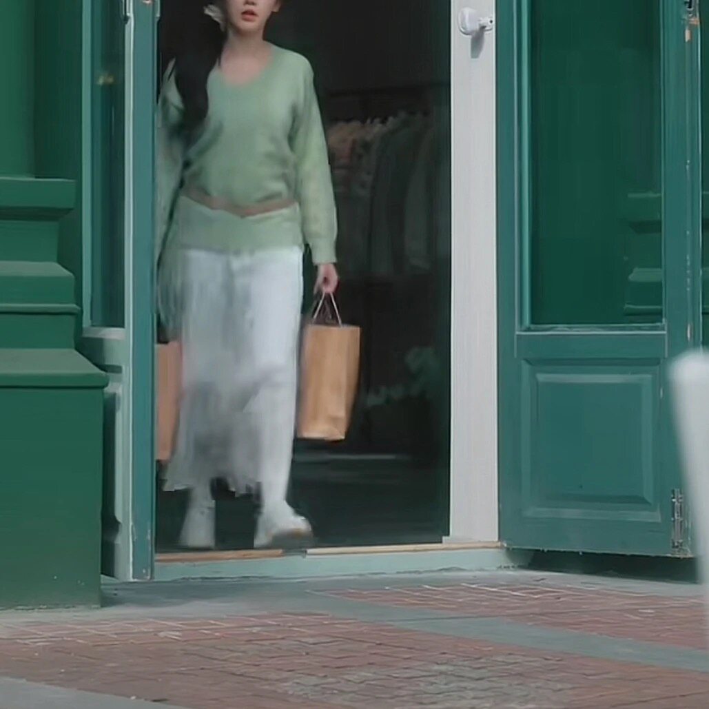 令颜同款 毛衣配腰带白色半身裙长裙 绿色V领针织衫