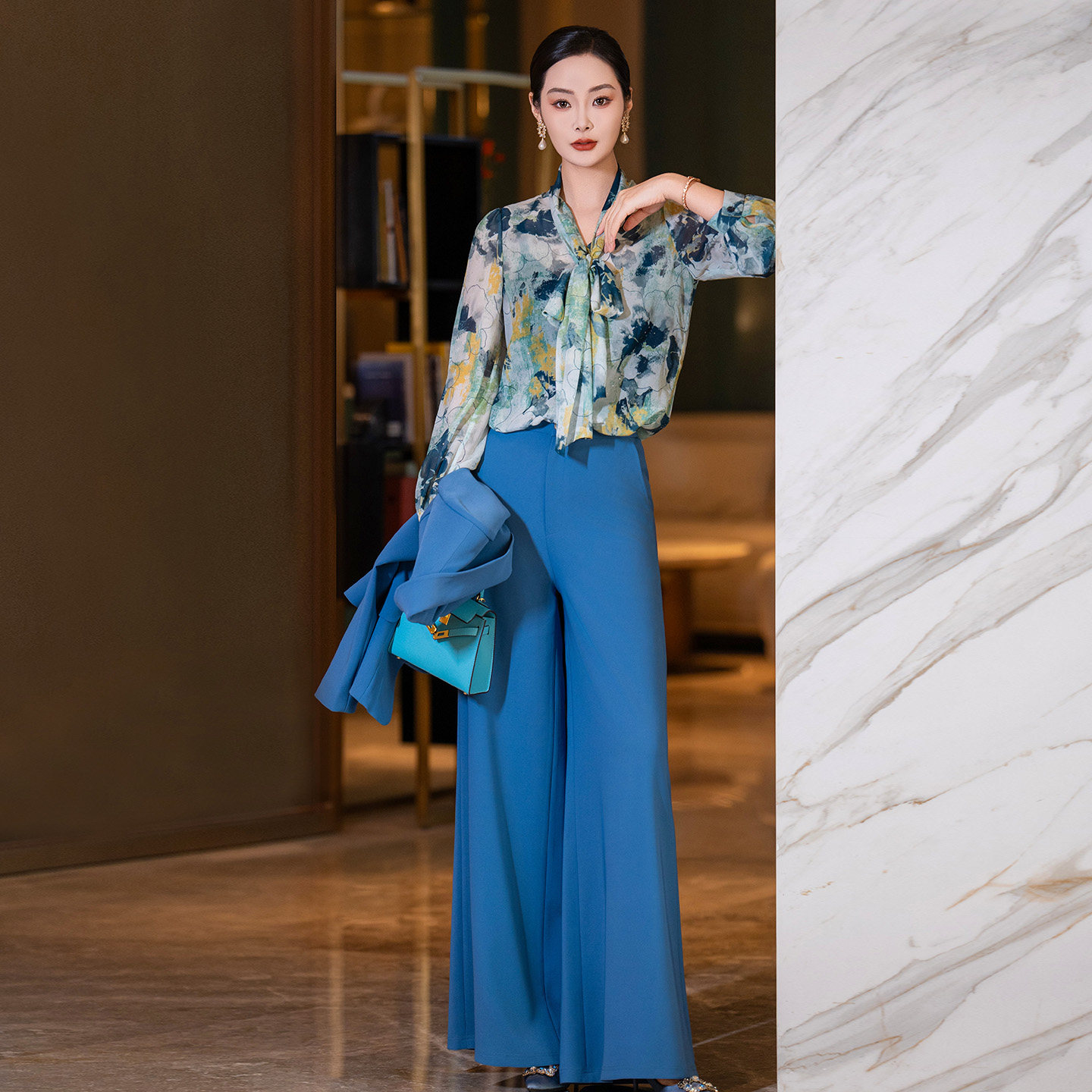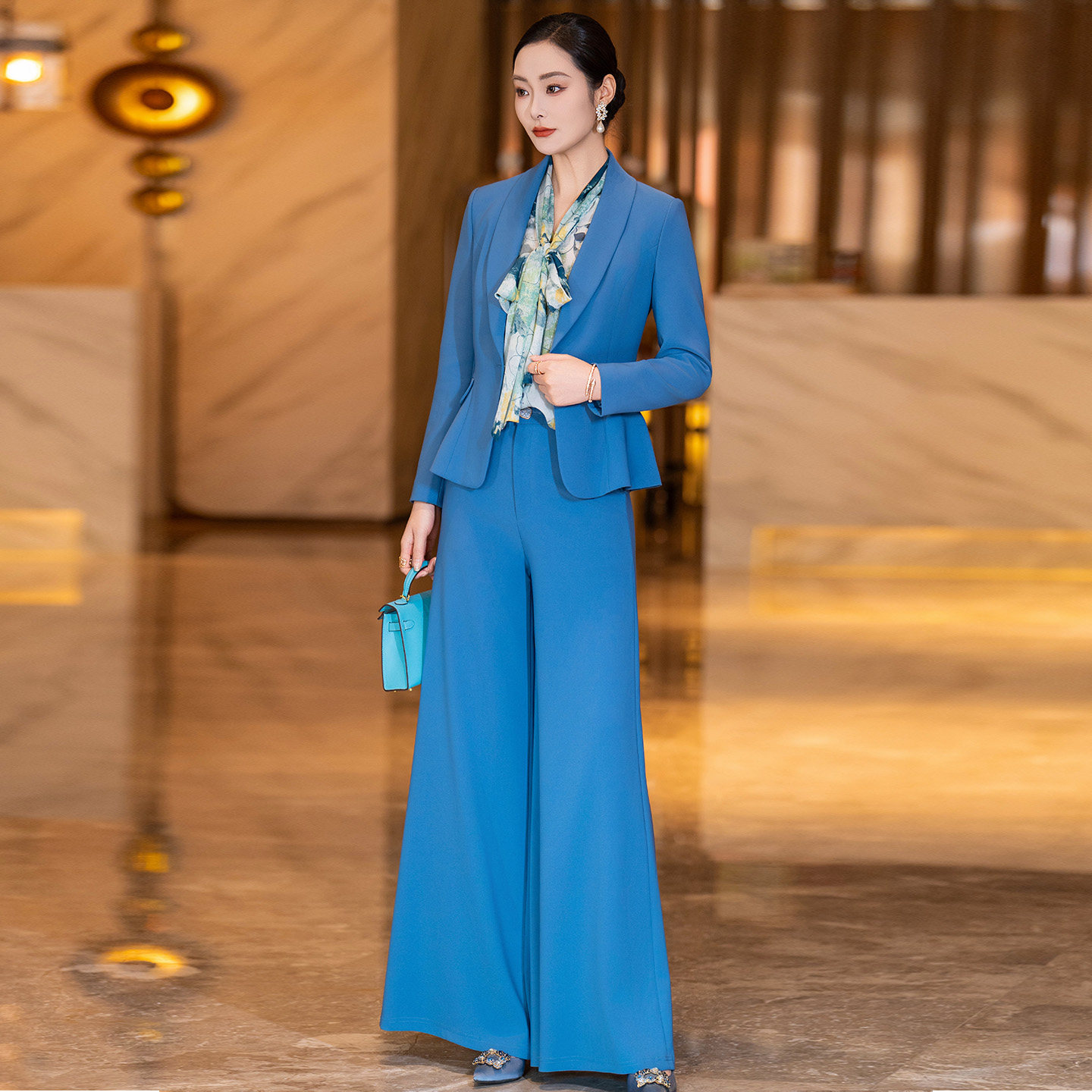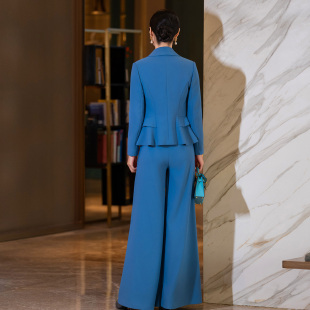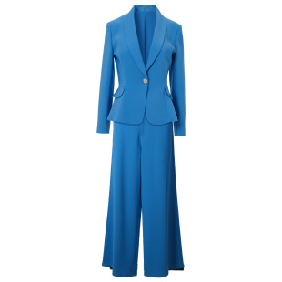 西装 蓝色收腰修身 垂感阔腿裤 套装 干练两件套 2026春新款 女时尚 女装