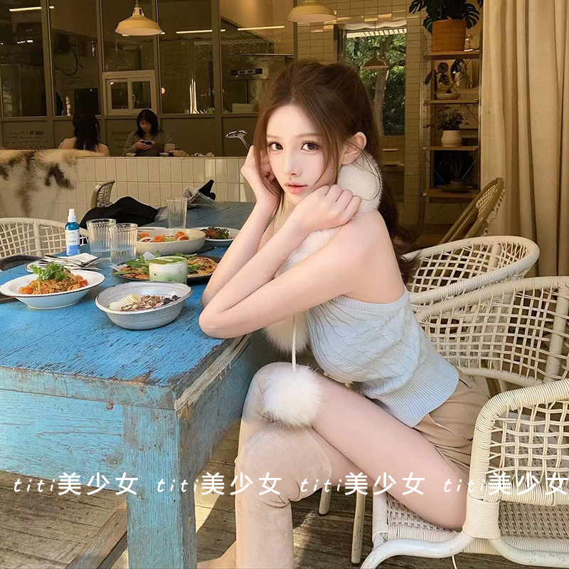 纯欲风绞花奶蓝纹理感挂脖收腰软绒背心吊带上衣 TiTi美少女