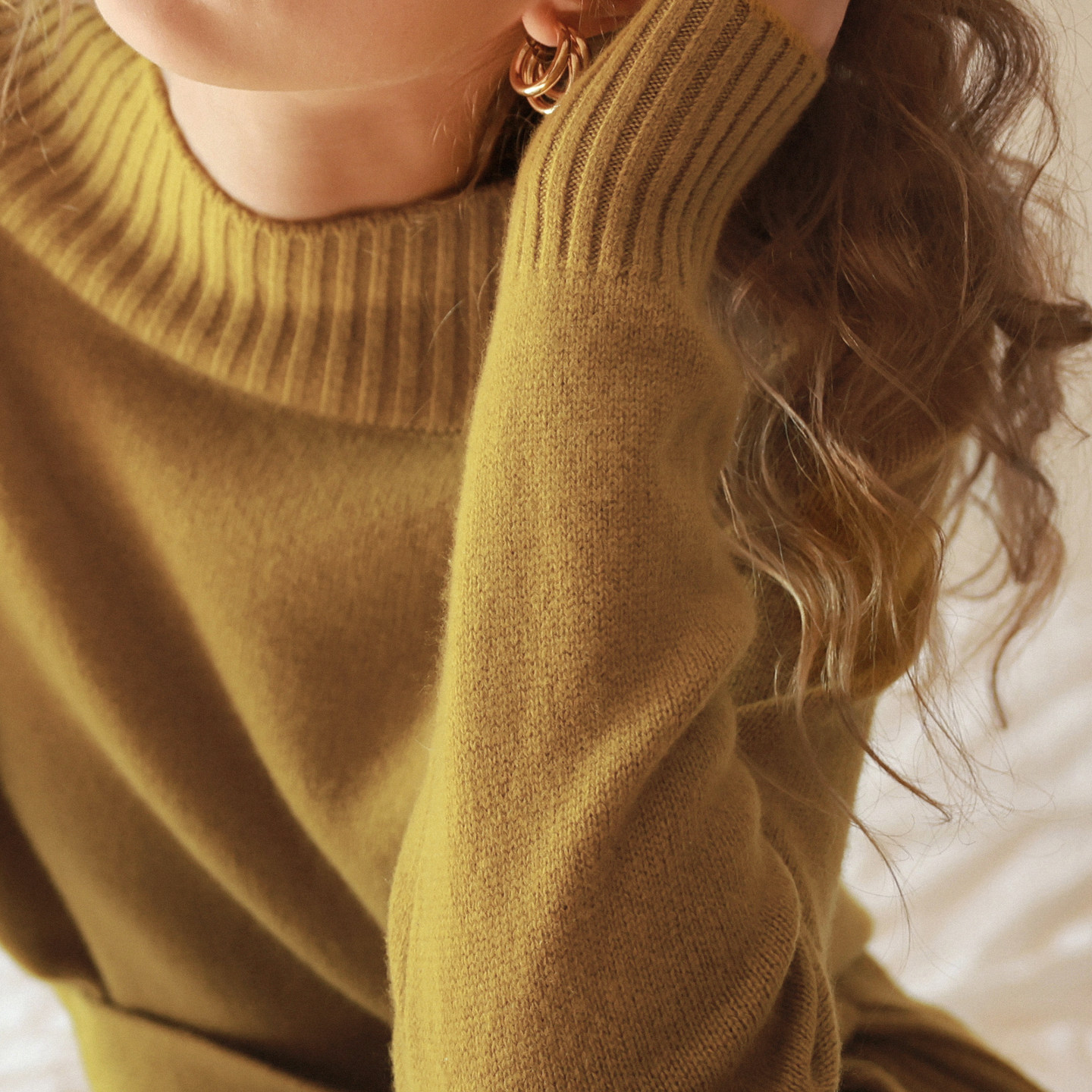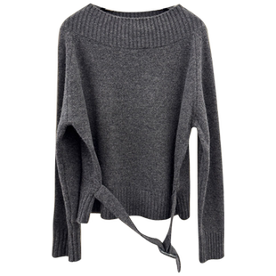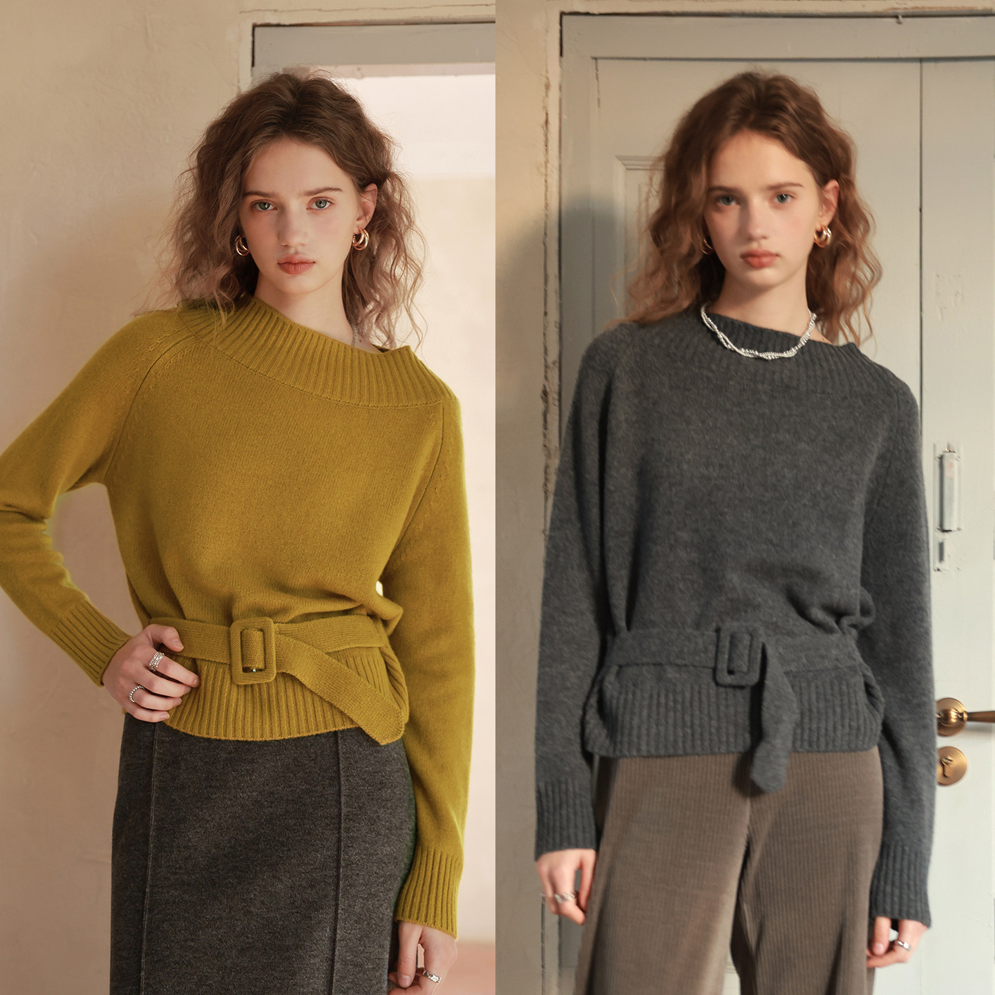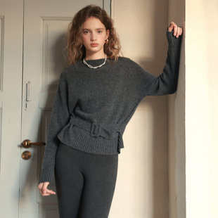 相对纶 收腰显瘦套头上衣黄灰毛衣 一字领100羊毛设计感巨好看女式