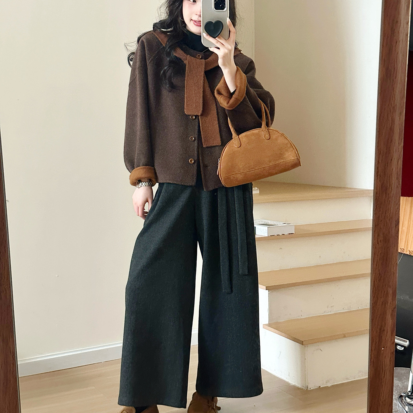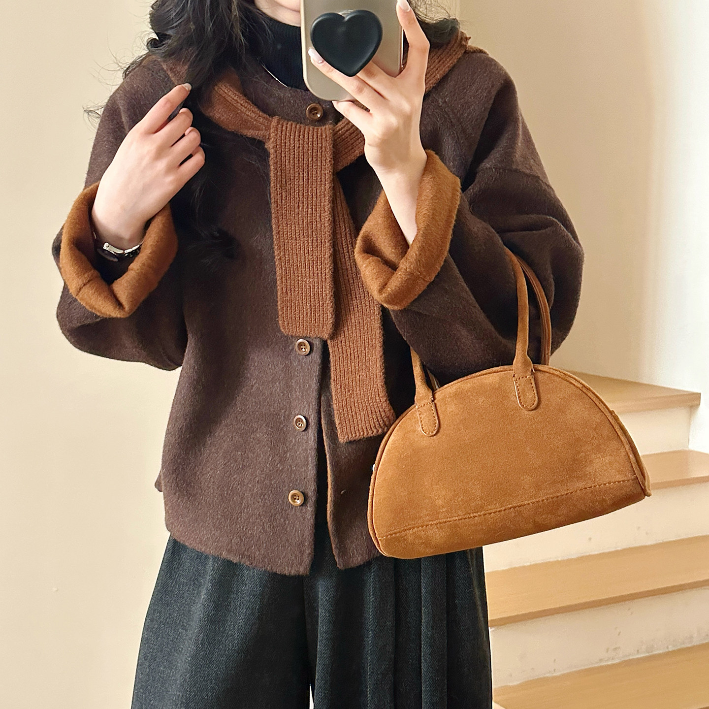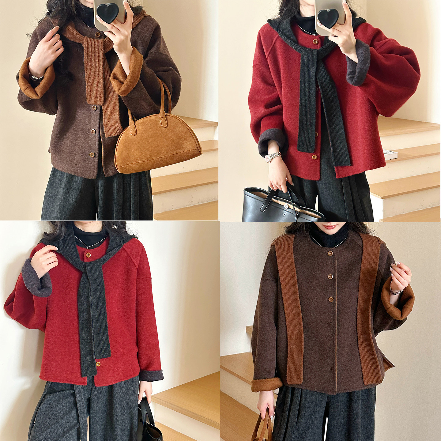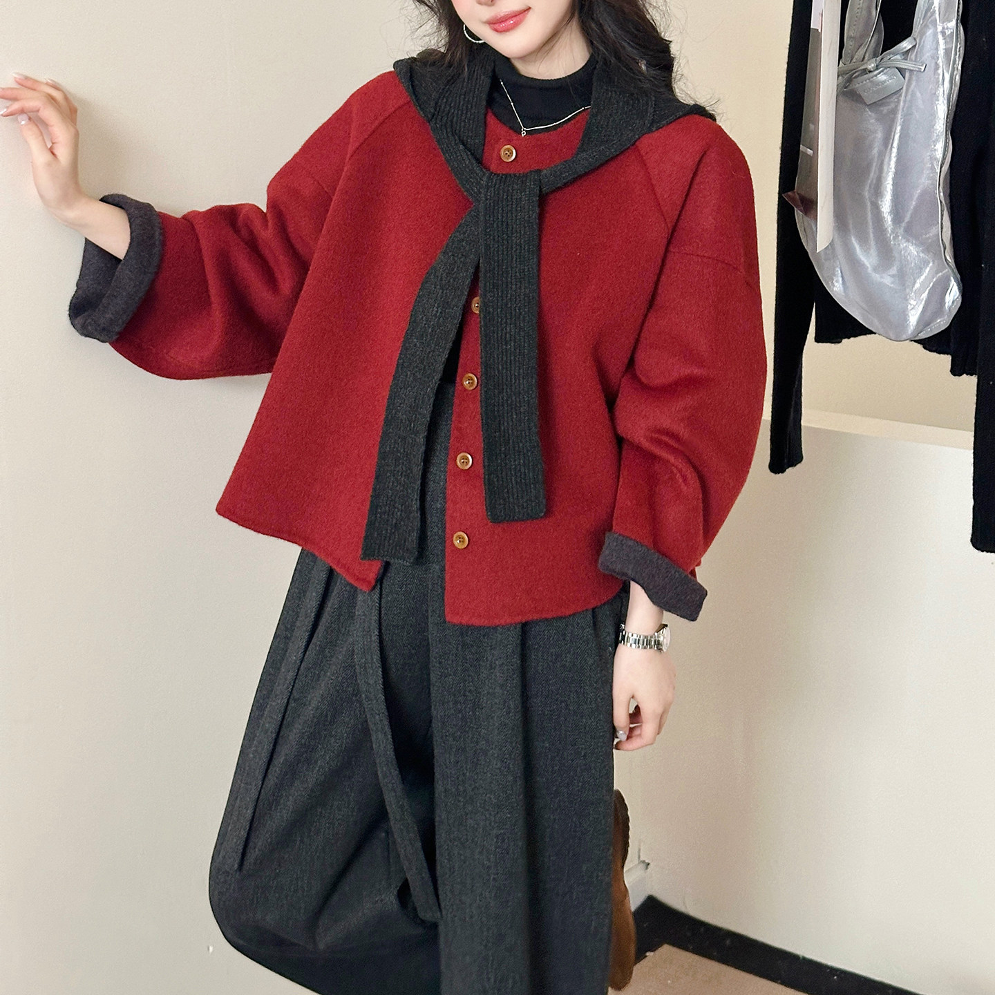 2025冬羊毛手工双面尼短外套女保暖围巾 焦糖色 糖安妮 新年红