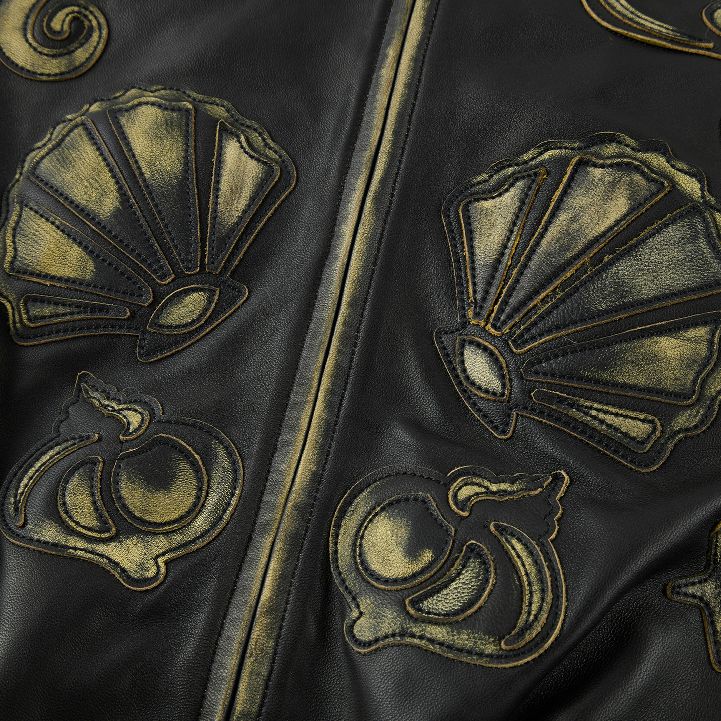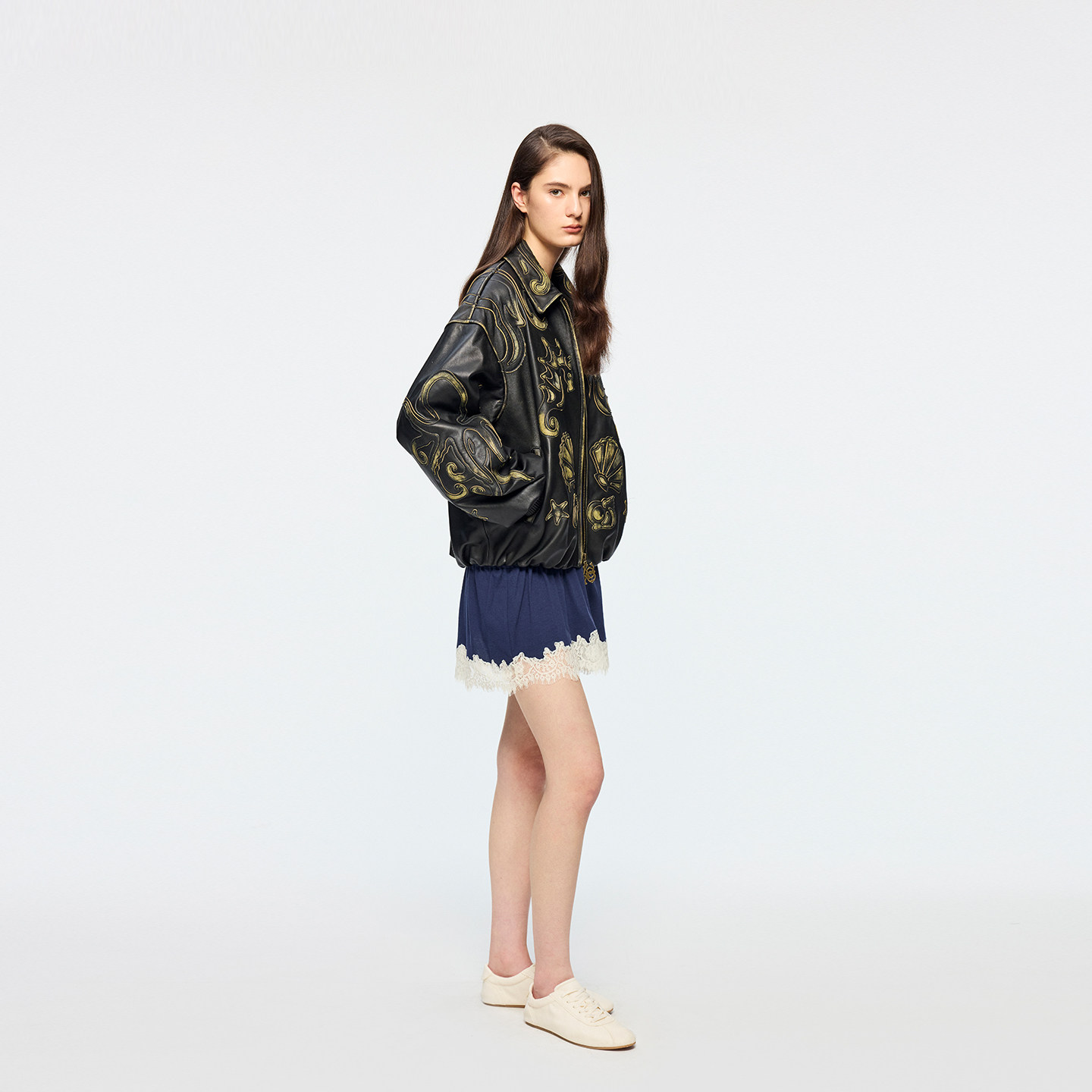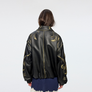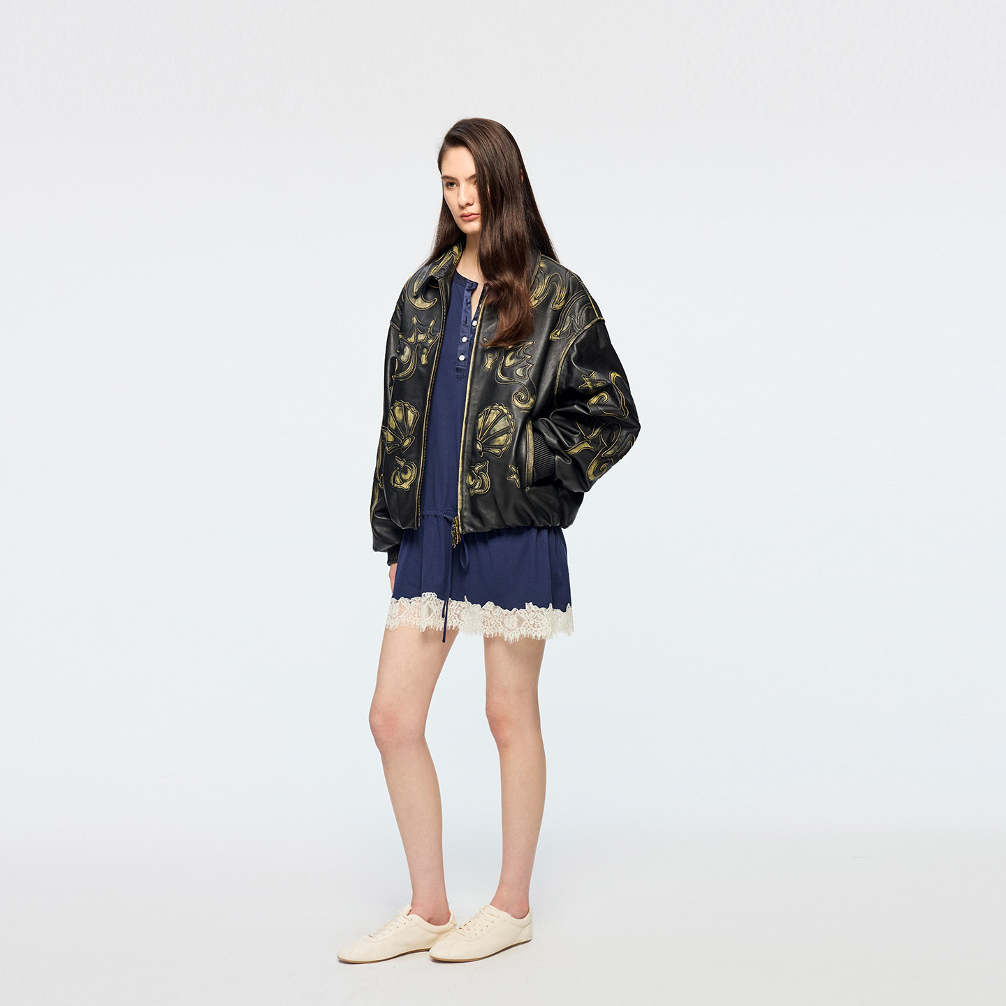 「奇幻海底」贴布绣擦色皮夹克 新款 UOOYAA 乌丫2026春季