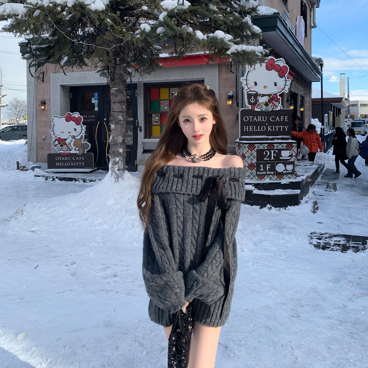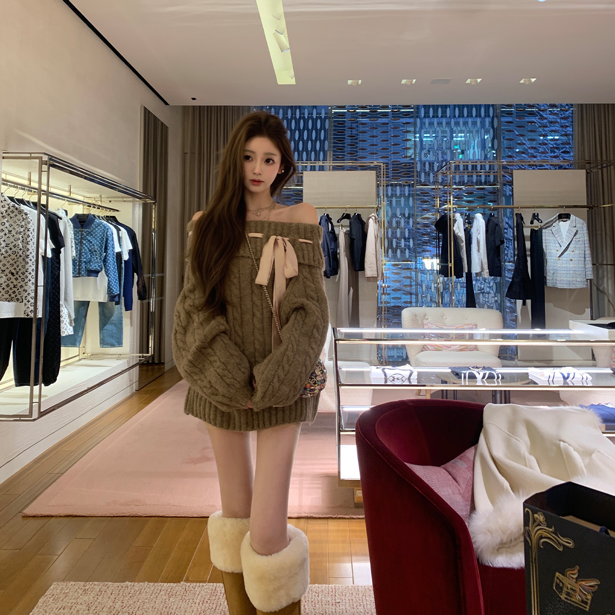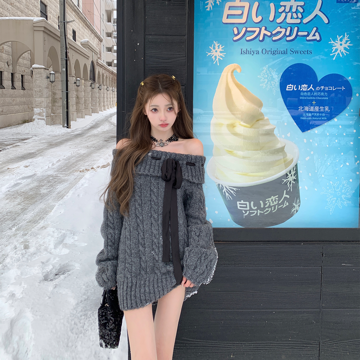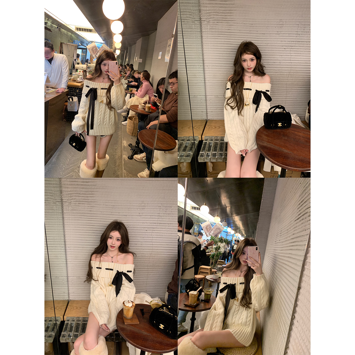 蝴蝶结三色绞花绑带versize针织毛衣裙 白色恋人 你 懒懒llan