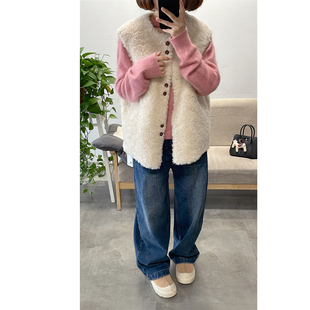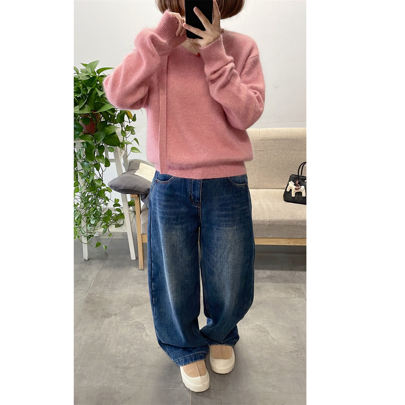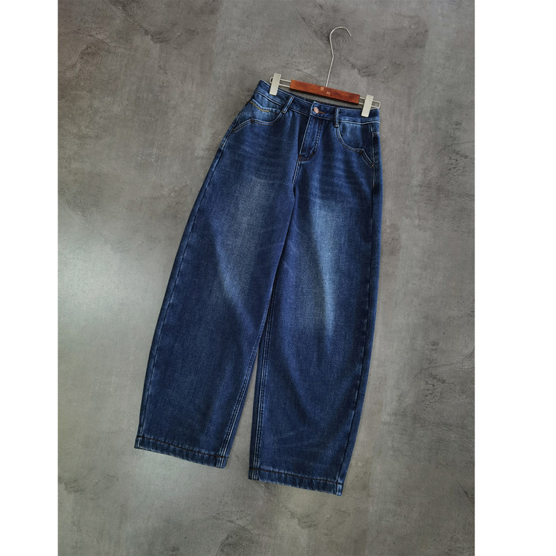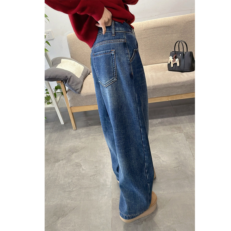 欧洲站 JEANS秋冬保暖复合绒梨型身材宽松休闲阔腿弯刀加绒牛仔裤