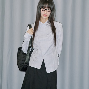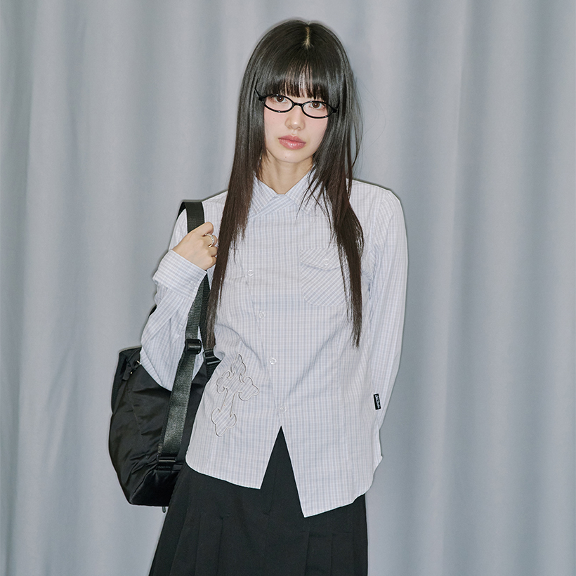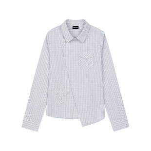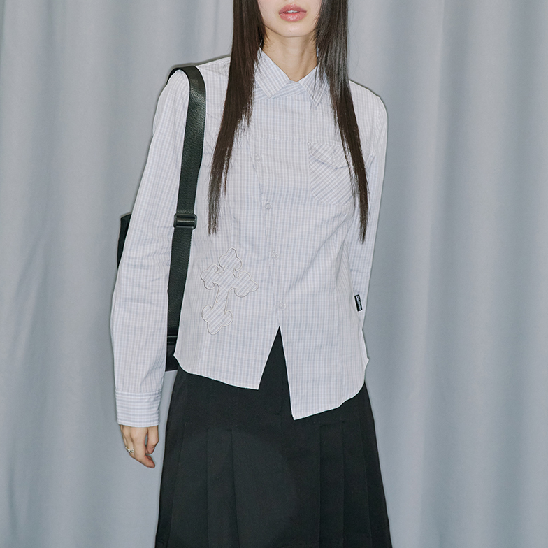 韩国代购 斜襟格纹衬衫 官网女装 高智风十字贴花修身 Musinsa 直邮
