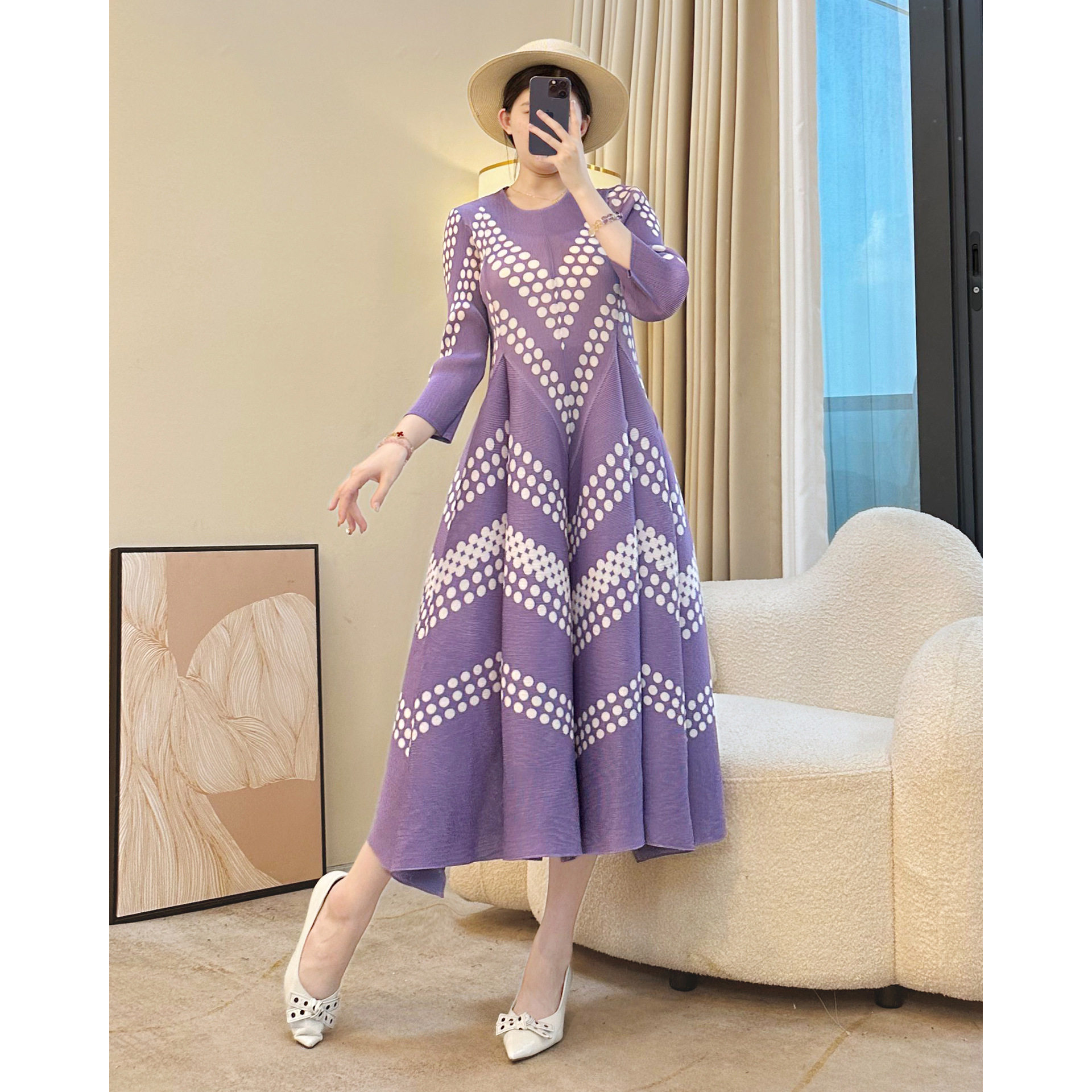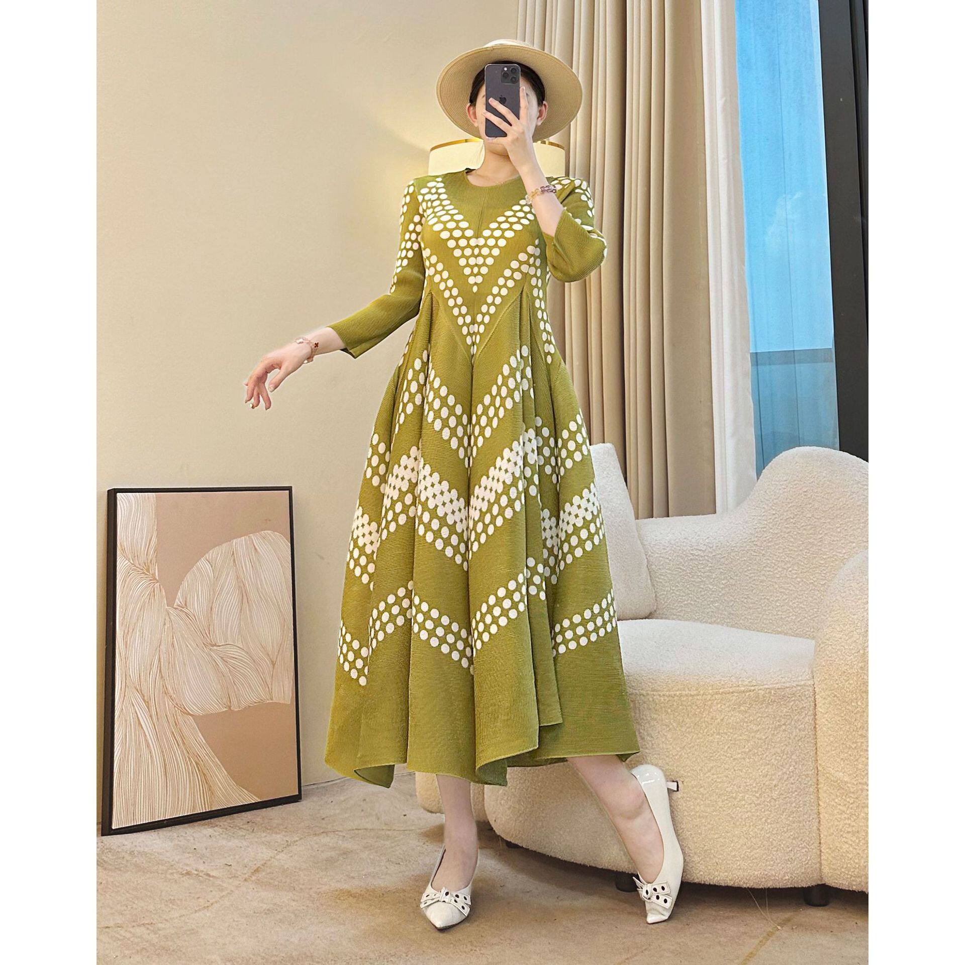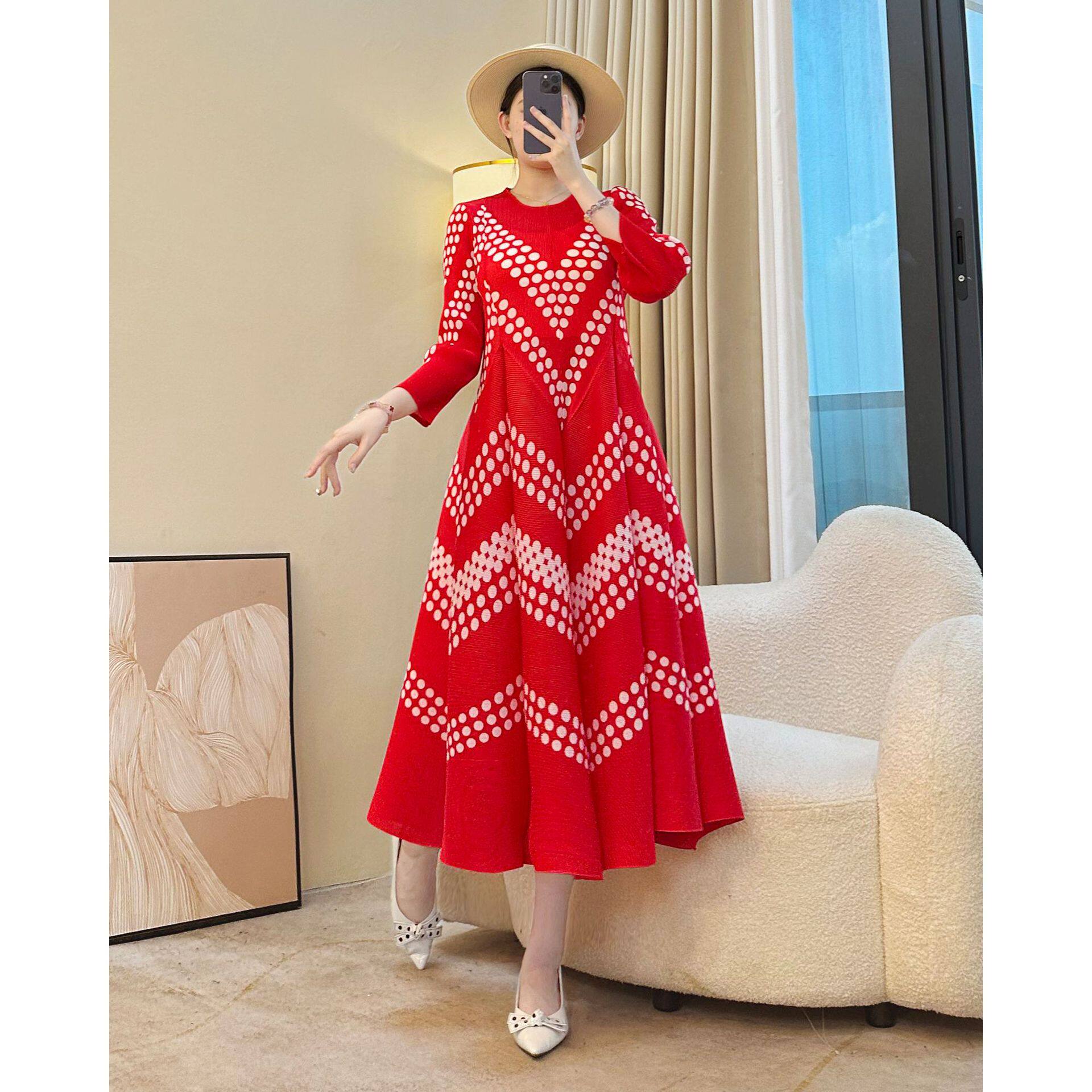 中年妈妈法式 显瘦A字长裙藏胯遮肉花苞裙 复古波点连衣裙秋冬大码