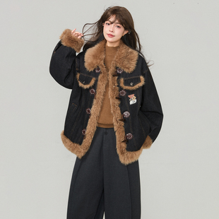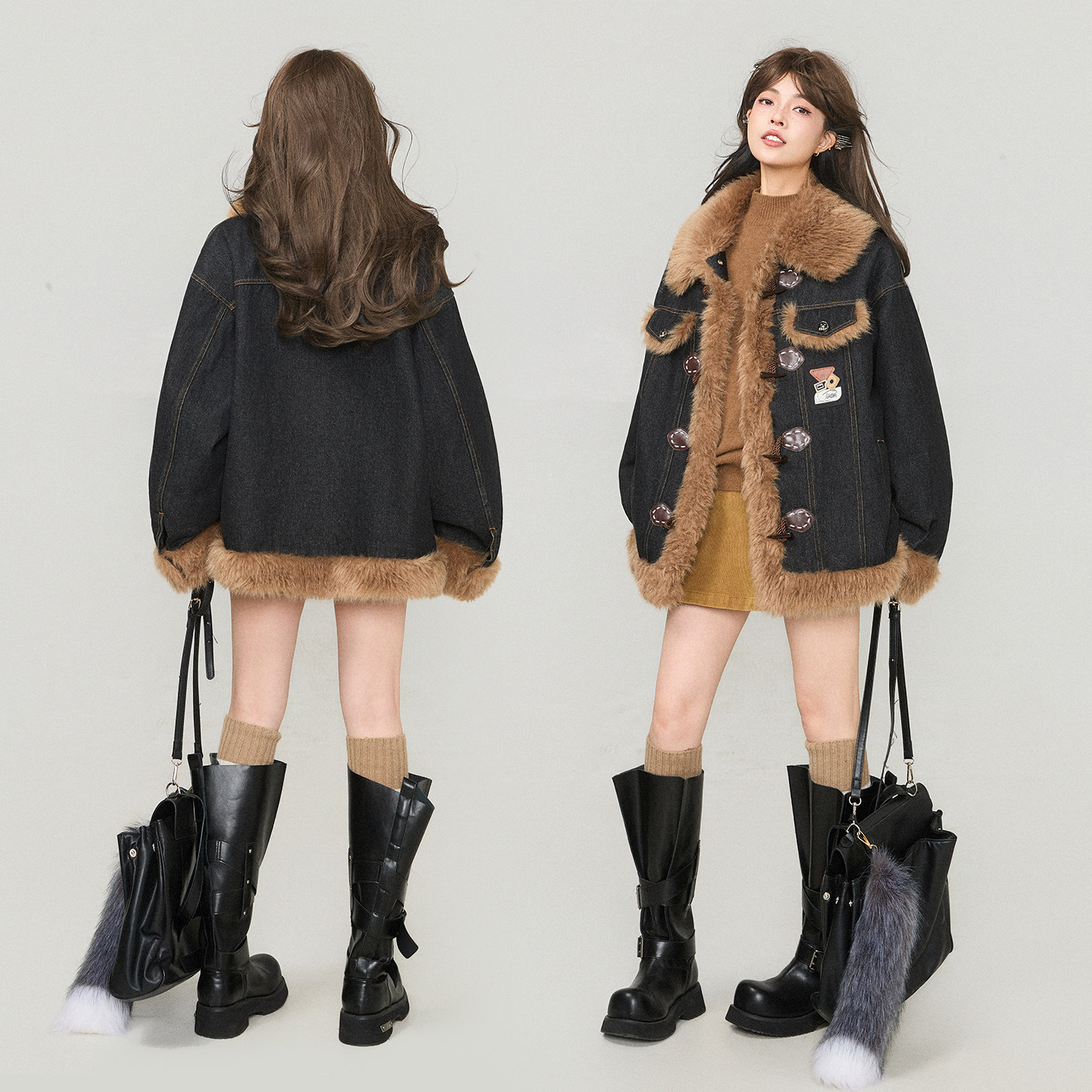 高级感羊羔毛拼接棉服 复古毛绒翻领牛仔外套冬季 KEIKO 绗缝夹棉