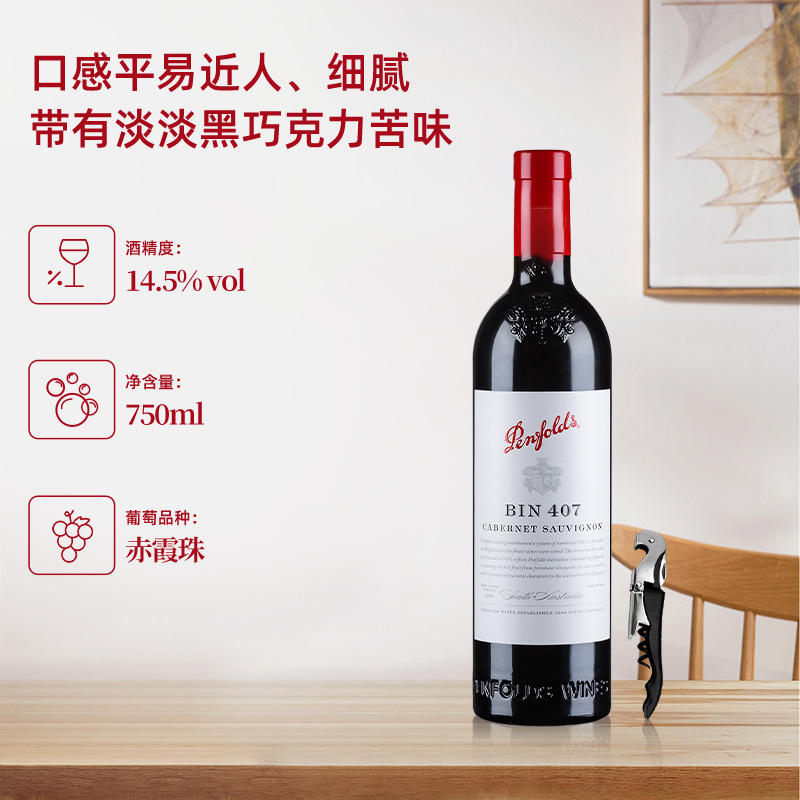 澳大利亚奔富BIN407进口赤霞珠干红6支木塞跨境Penfolds 自营