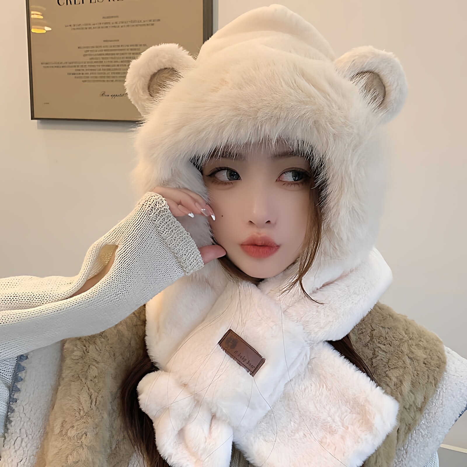 围巾一体防风帽毛绒保暖可爱加厚围脖护耳秋冬季 新款 小熊帽子女款