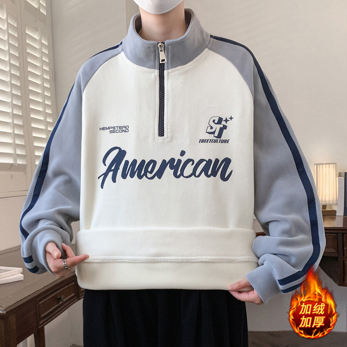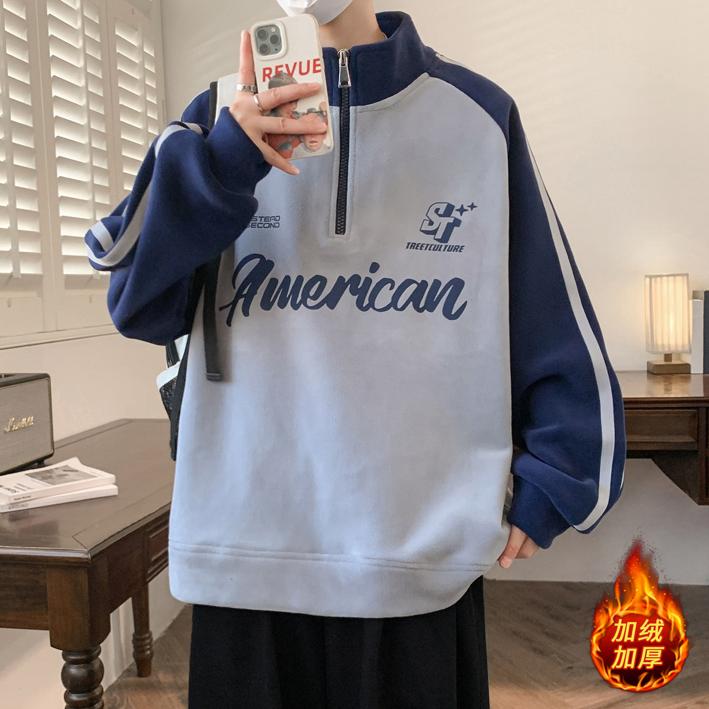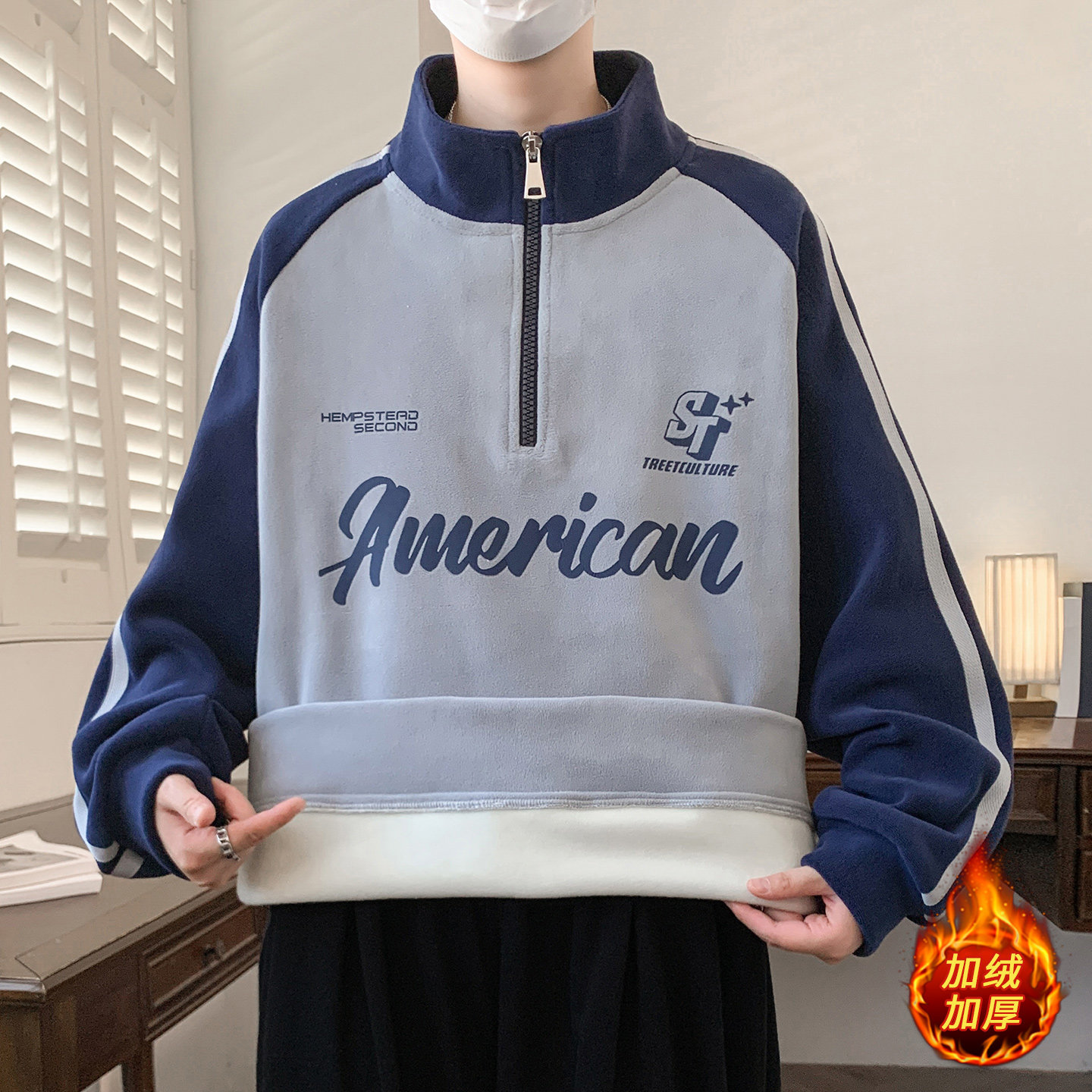 青少年秋冬款 半高领拉链奥粒绒卫衣宽松舒适加绒加厚保暖上衣 男装