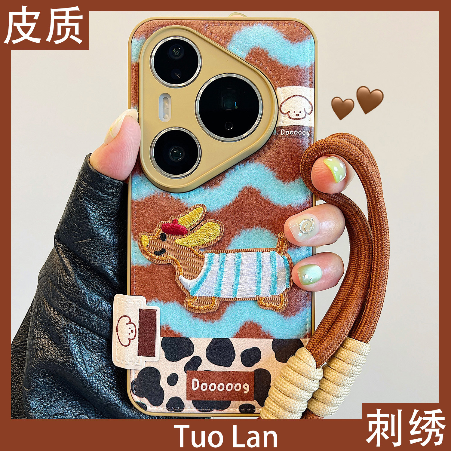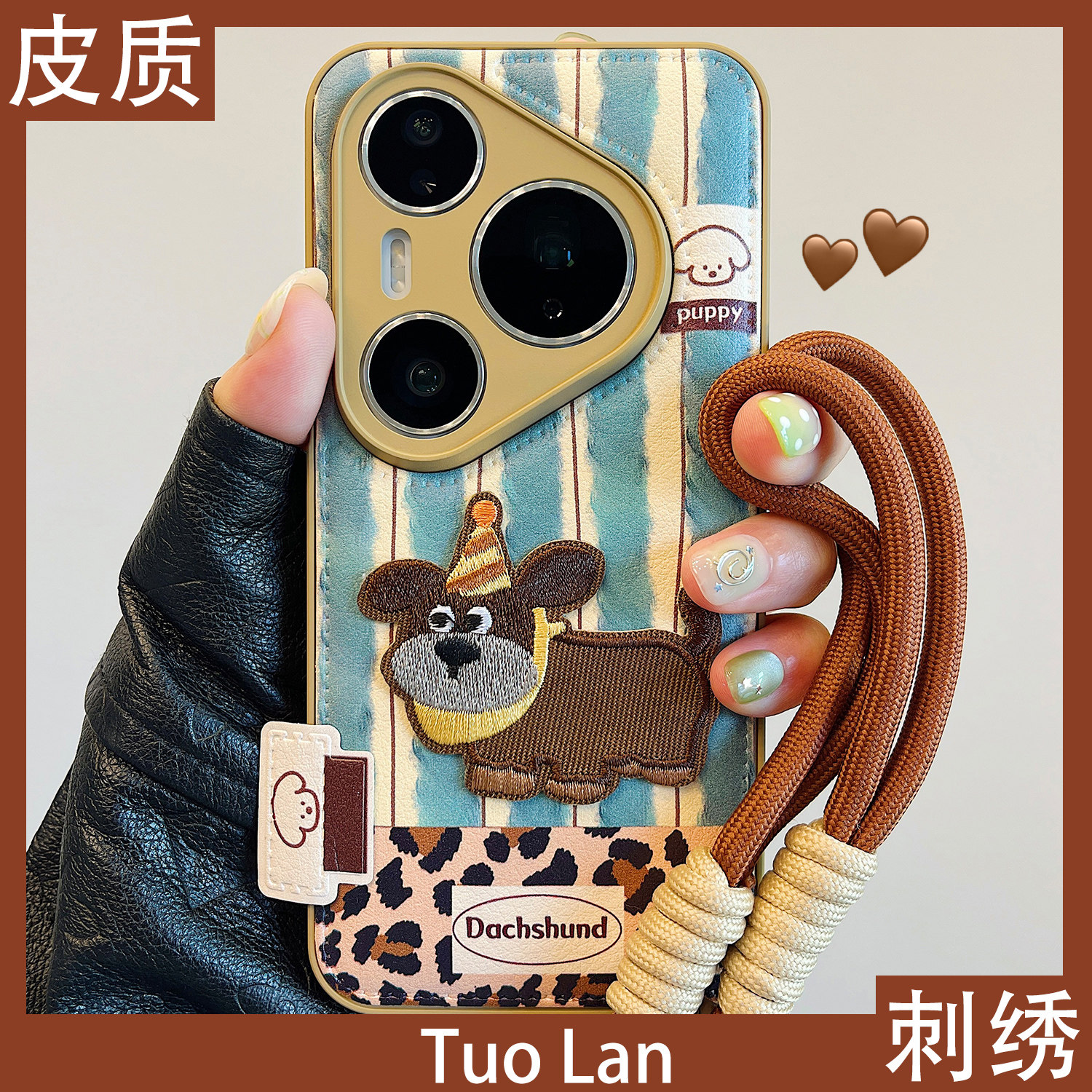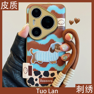 拓岚 手机壳情侣Pura80ultra秋冬p60复古卡通立体刺绣腊肠狗mate80 新款 6pro皮质挂绳 适用华为pura70pro