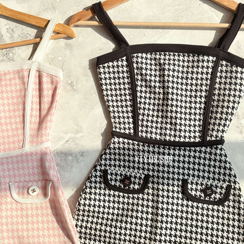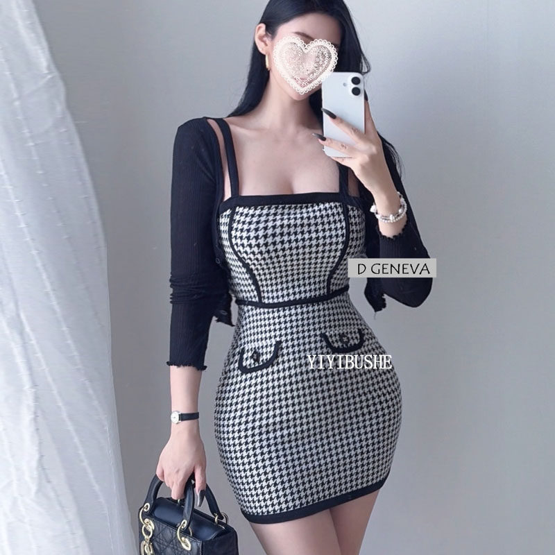 性感女人味千鸟格包臀吊带连衣裙 LU222漂亮显身材 韩国代购 正品