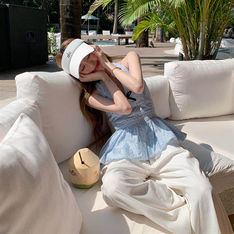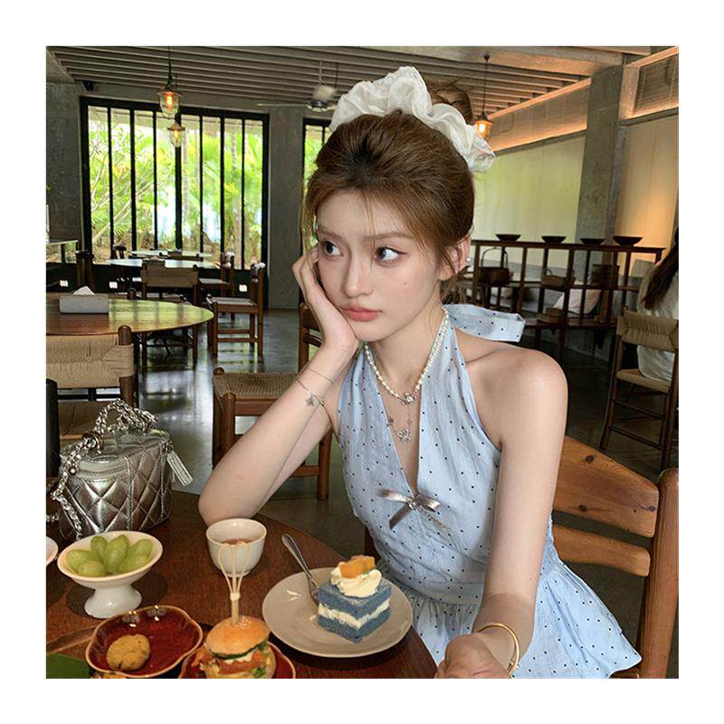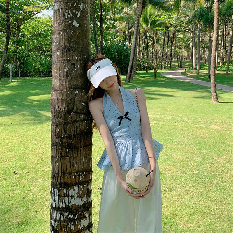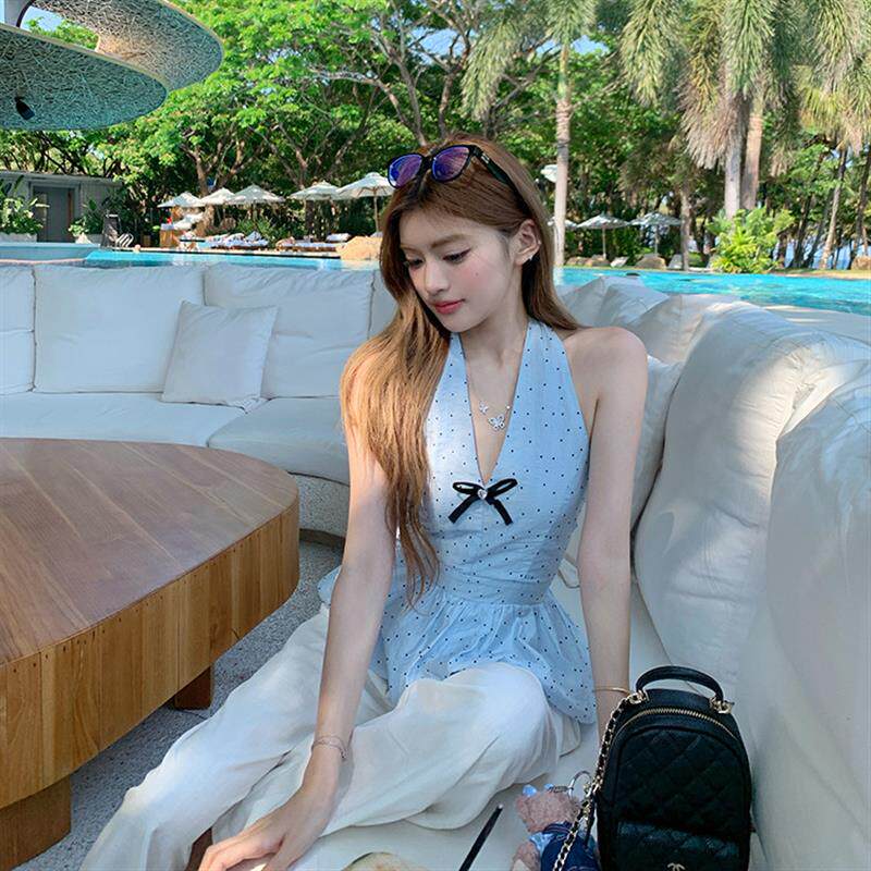 小衫 显瘦花苞下摆挂脖上衣女夏无袖 蓝色波点上衣修身 小火山努努