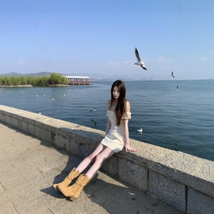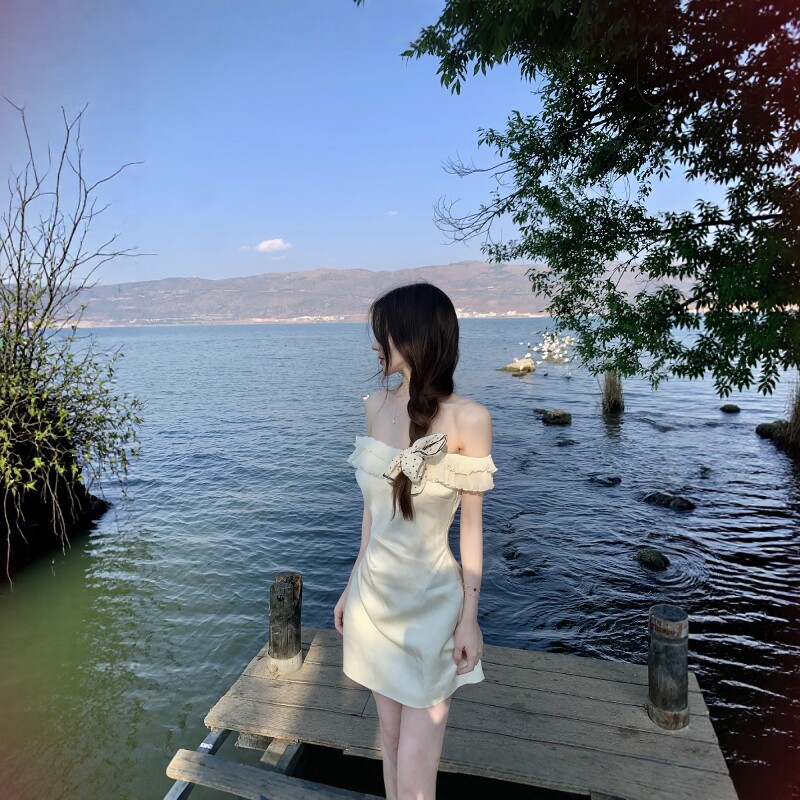 包臀短裙 浪漫少女高级感修身 法式 荷叶边白色一字肩连衣裙子女夏季