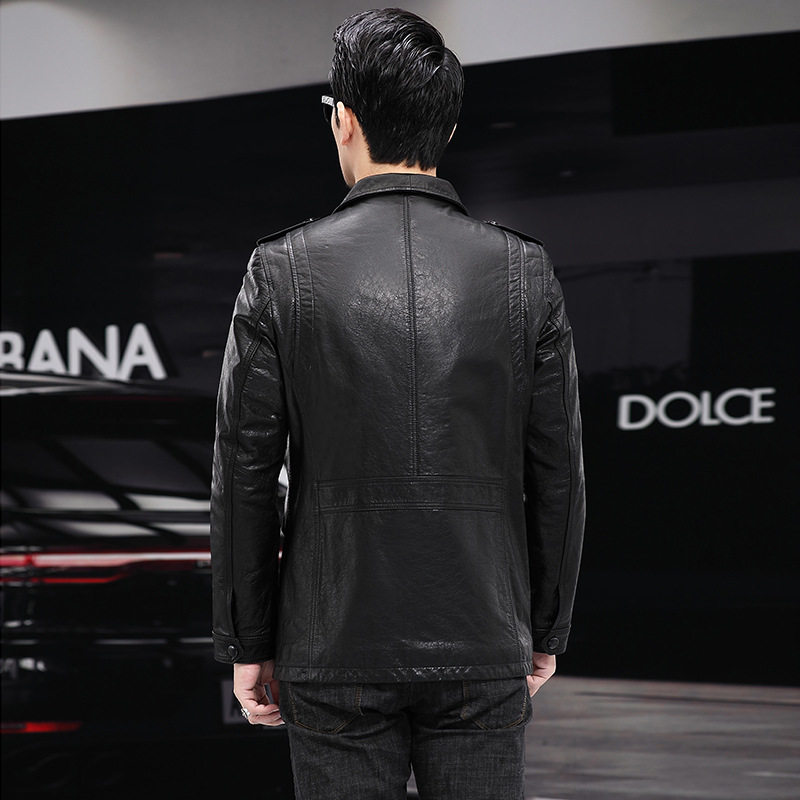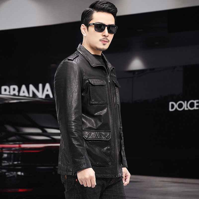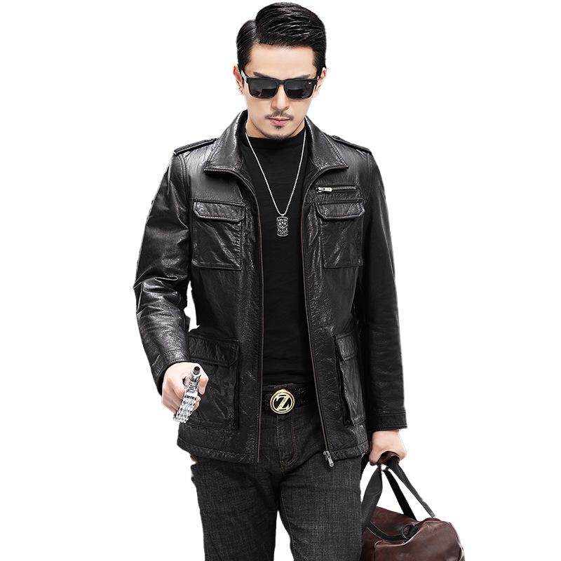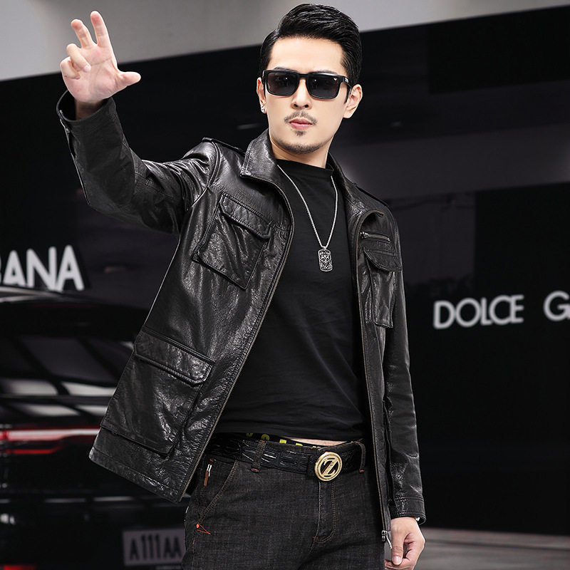 多口袋单装 薄款 皮夹克外套 牛皮皮衣男头层皮翻领商务休闲春季 新款