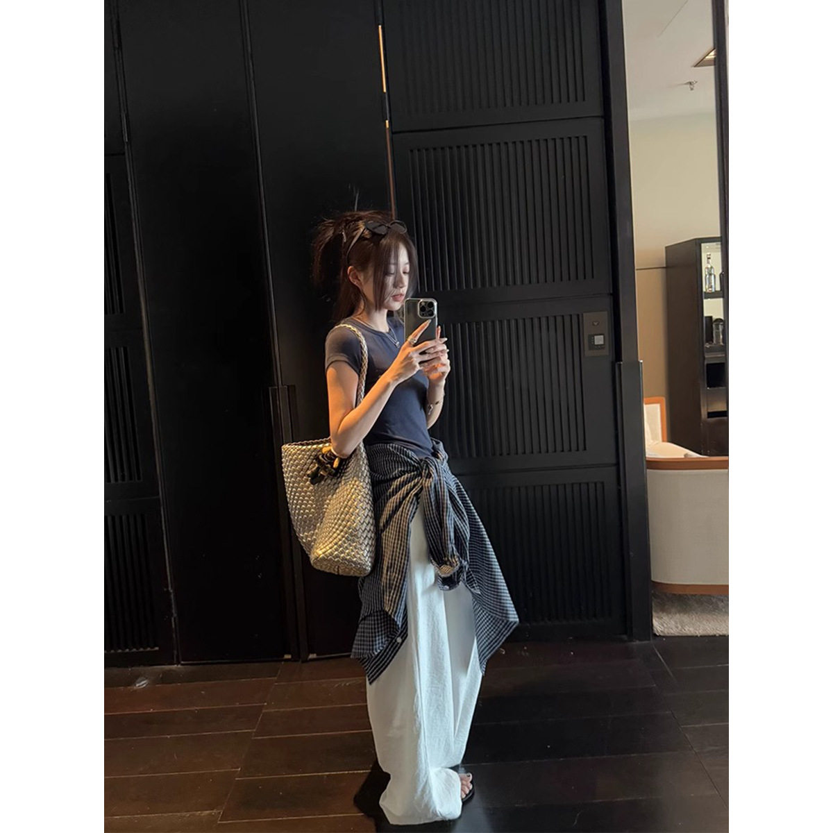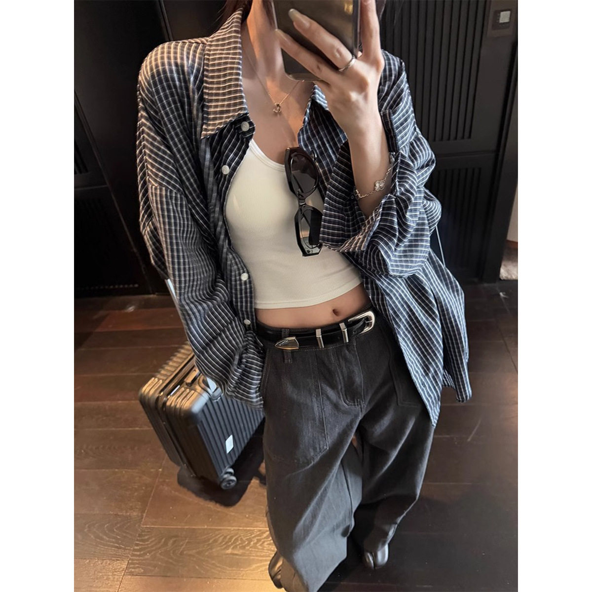 蓝调时刻复古高支棉宽松显瘦长袖 百搭格纹衬衫