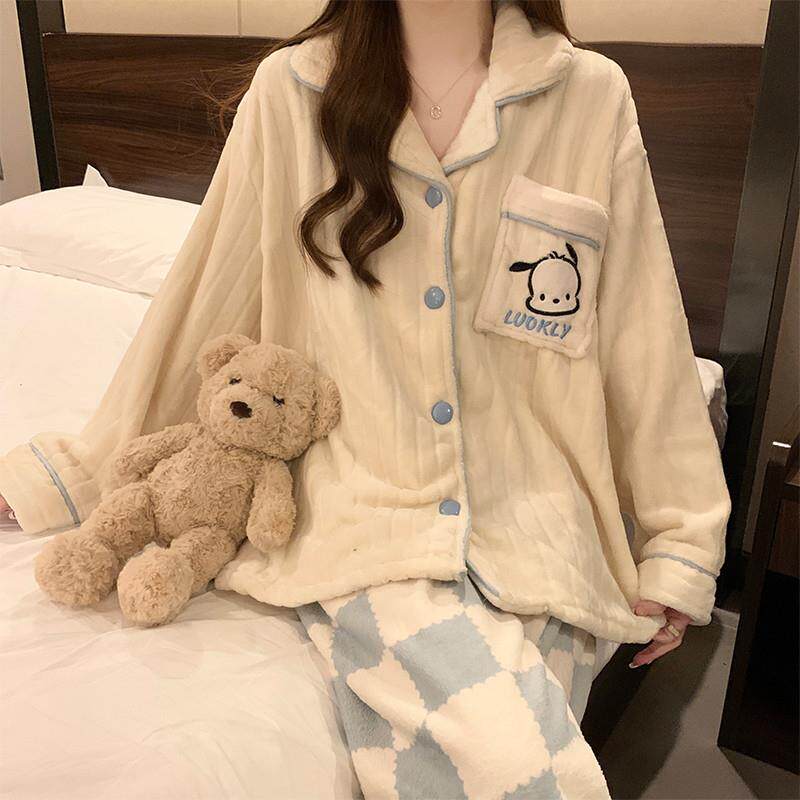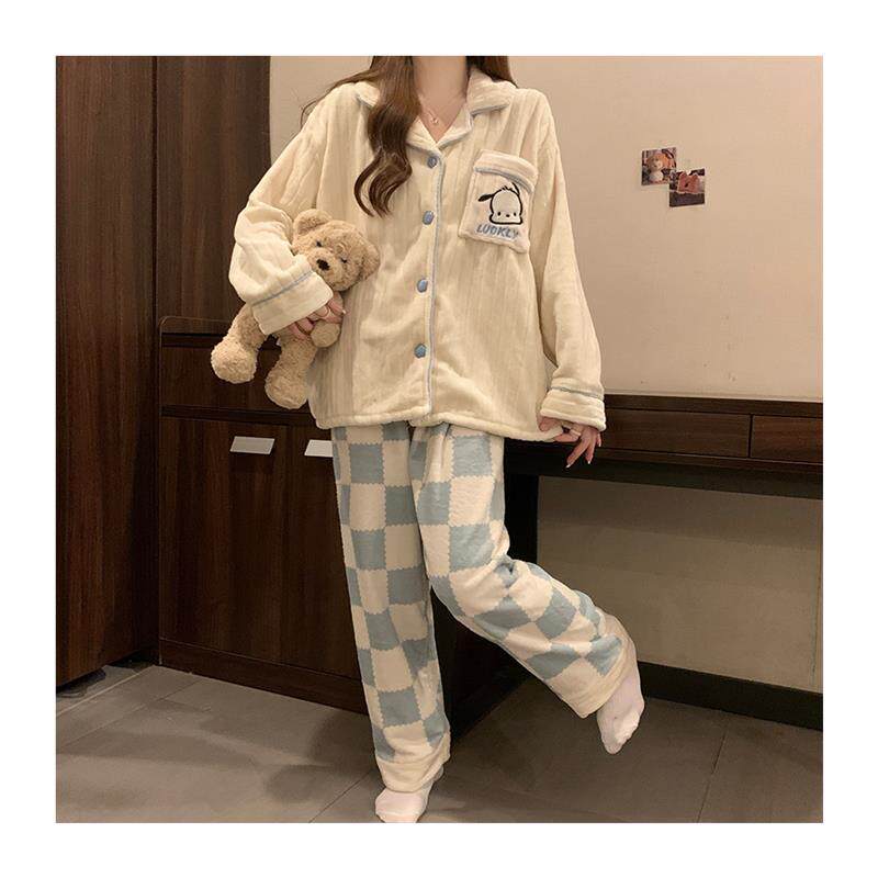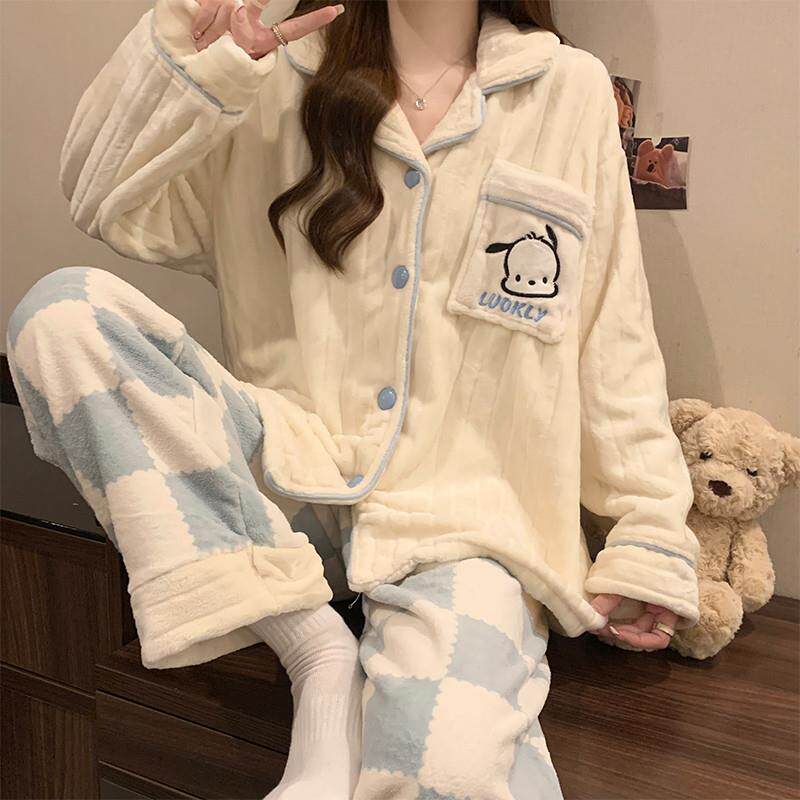 家居服套装 珊瑚绒睡衣女秋冬季 开衫 多巴胺长袖 加绒加厚2025年新款
