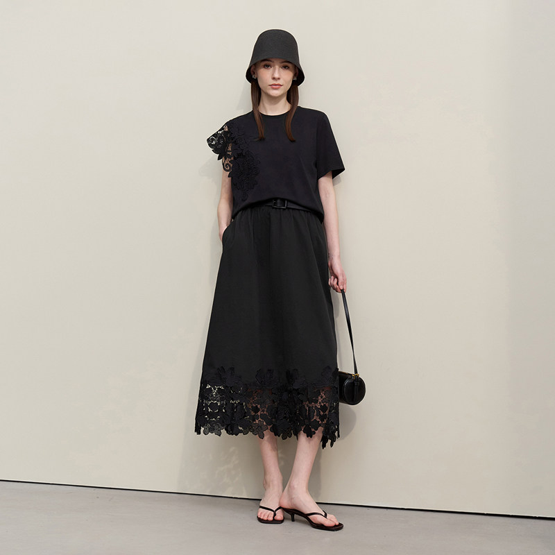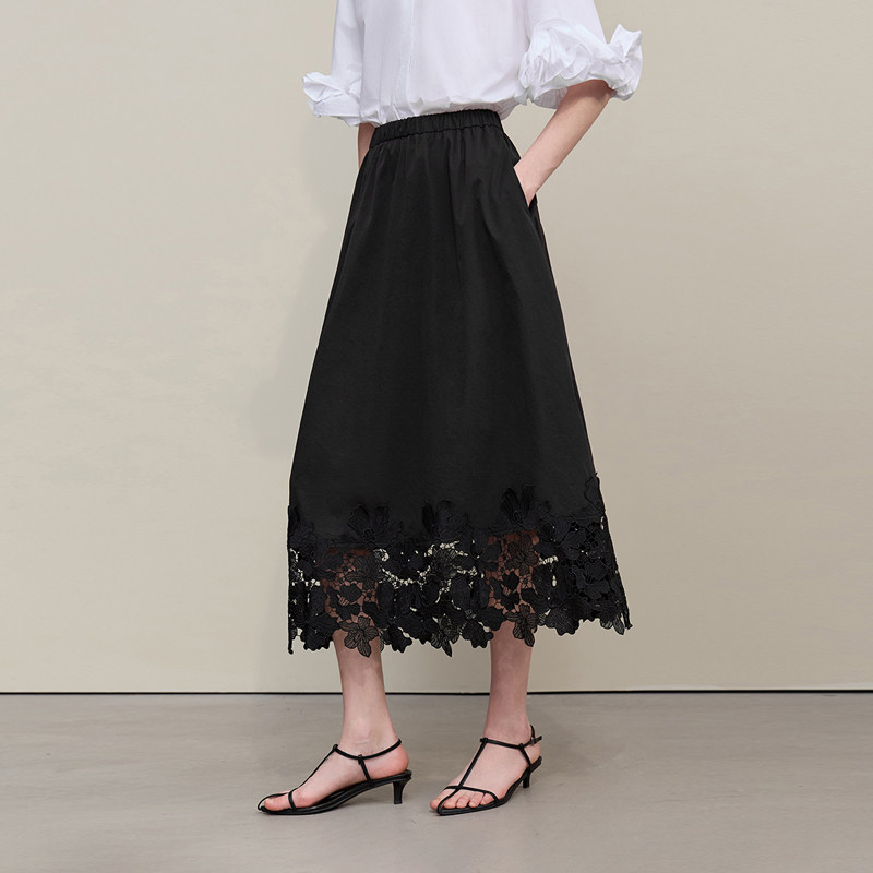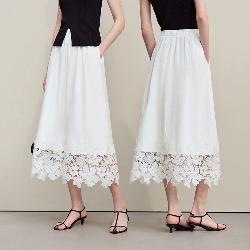Amii2026夏新款 优雅浪漫橡筋腰头镂空蕾丝拼接半身裙女宽松裙子