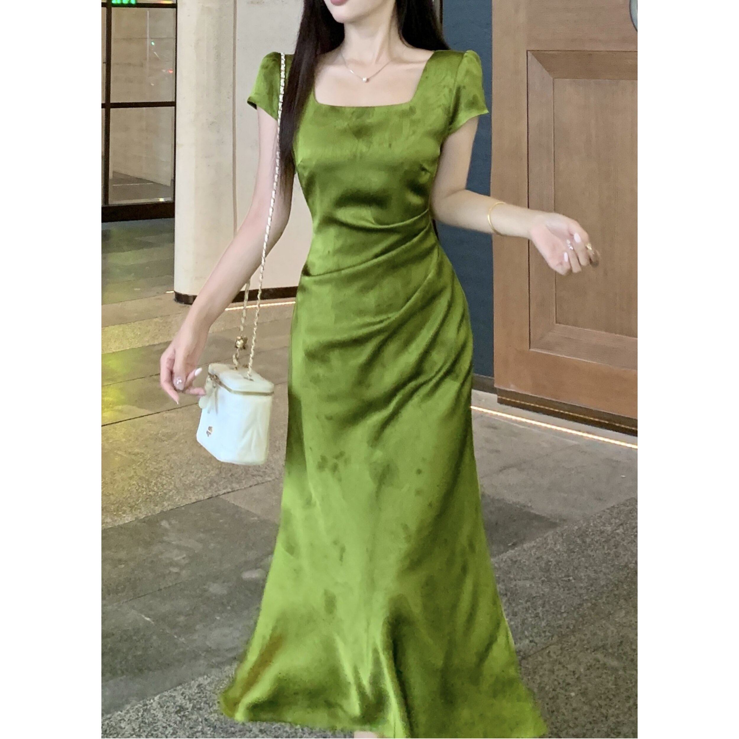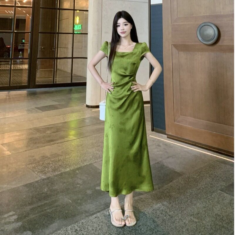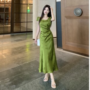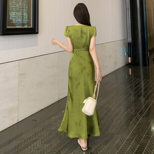 微胖mm显瘦改良旗袍长裙子 连衣裙女夏季 大码 国风气质提花方领短袖