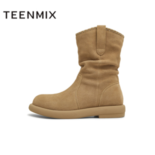 周雨彤同款 百丽女靴周游世界复古美拉德西部靴加绒雪地靴短筒靴