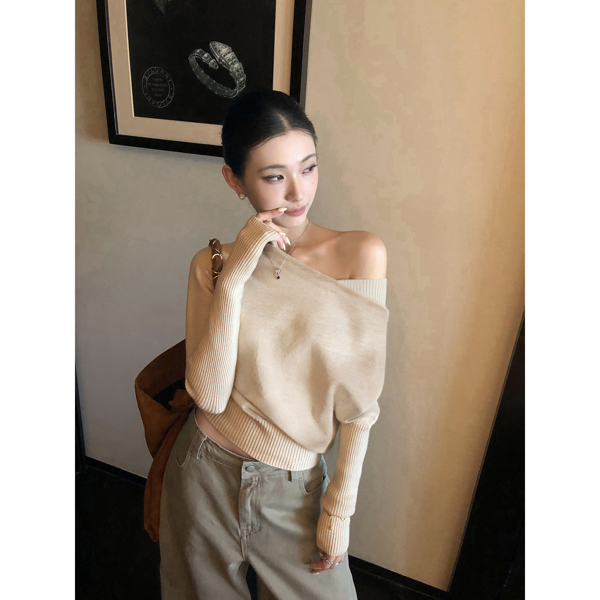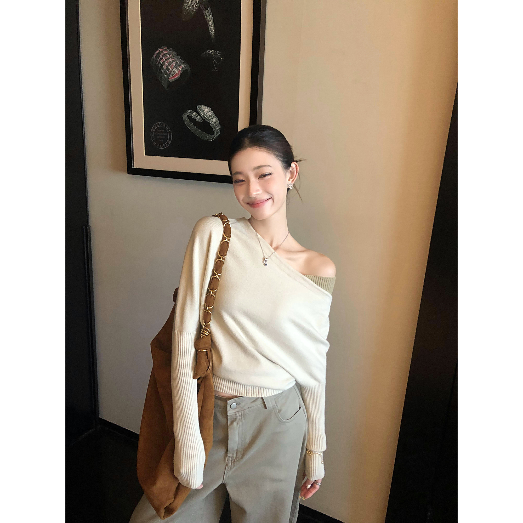 毛衣针织衫 撞色斜肩拼接长袖 女气质露肩慵懒上衣 秋日赴约 辰米范