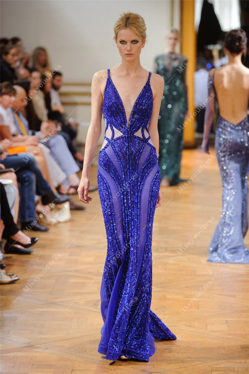 鱼尾名媛宴会酒会生日主持晚礼服 重工宝蓝色深V修身 2020新款 时尚