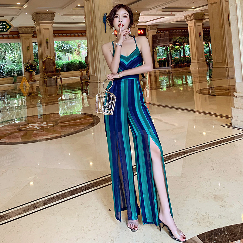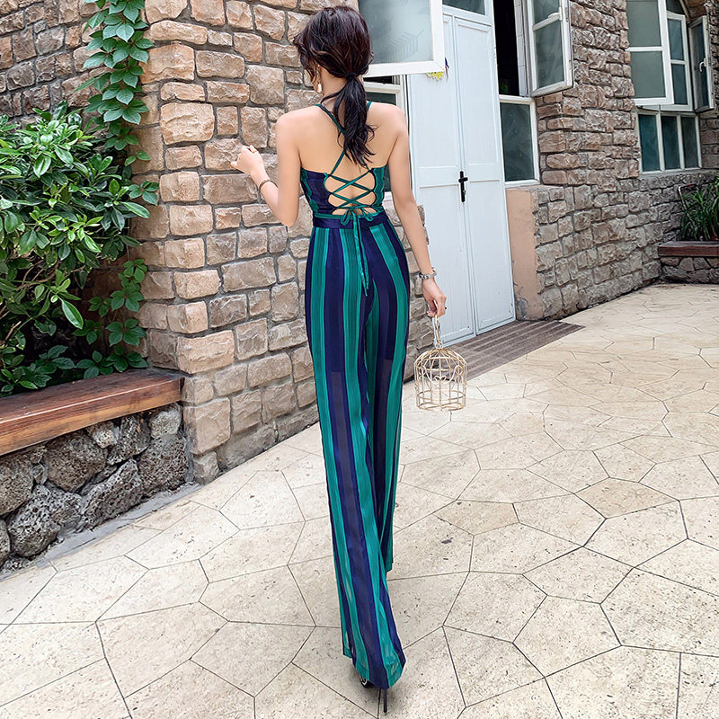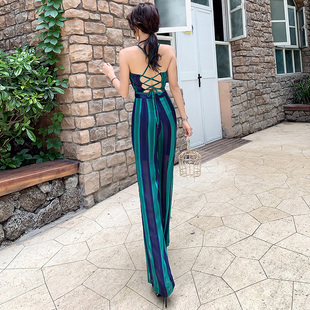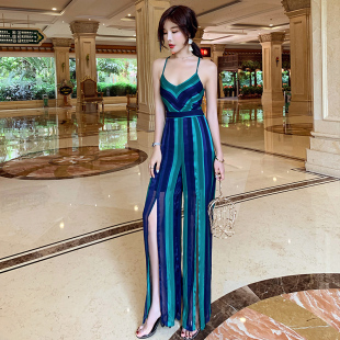 条纹开叉连衣裤 名媛风性感气质露背吊带度假连体裤 女 新款 2025夏装