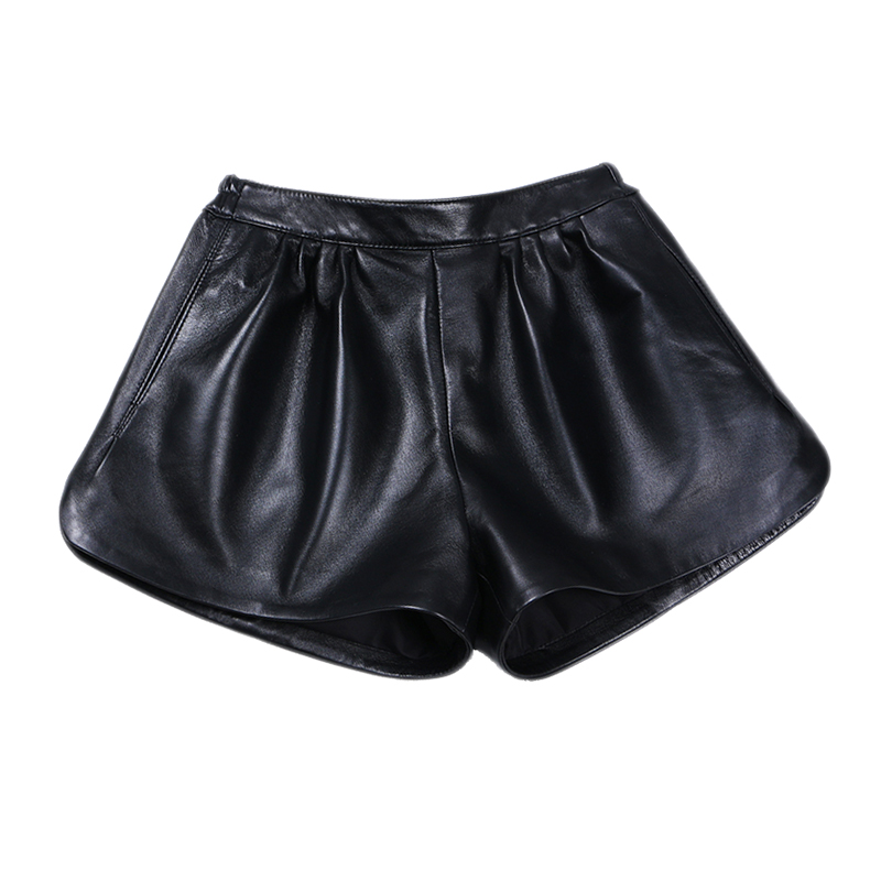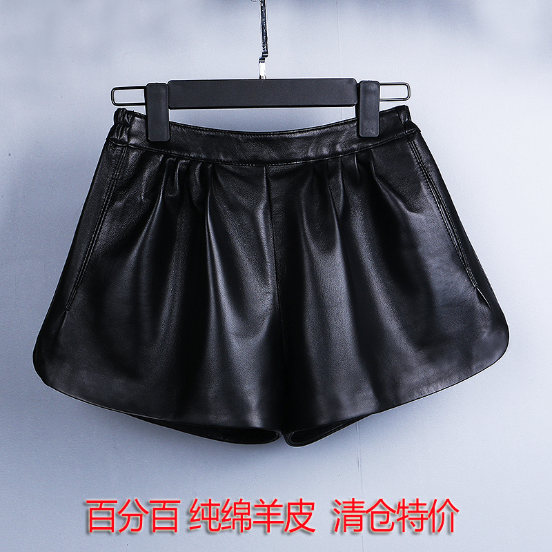 a字松紧高腰宽松显瘦阔腿裤 女纯绵羊皮短裤 外穿 真皮皮裤 清仓特价