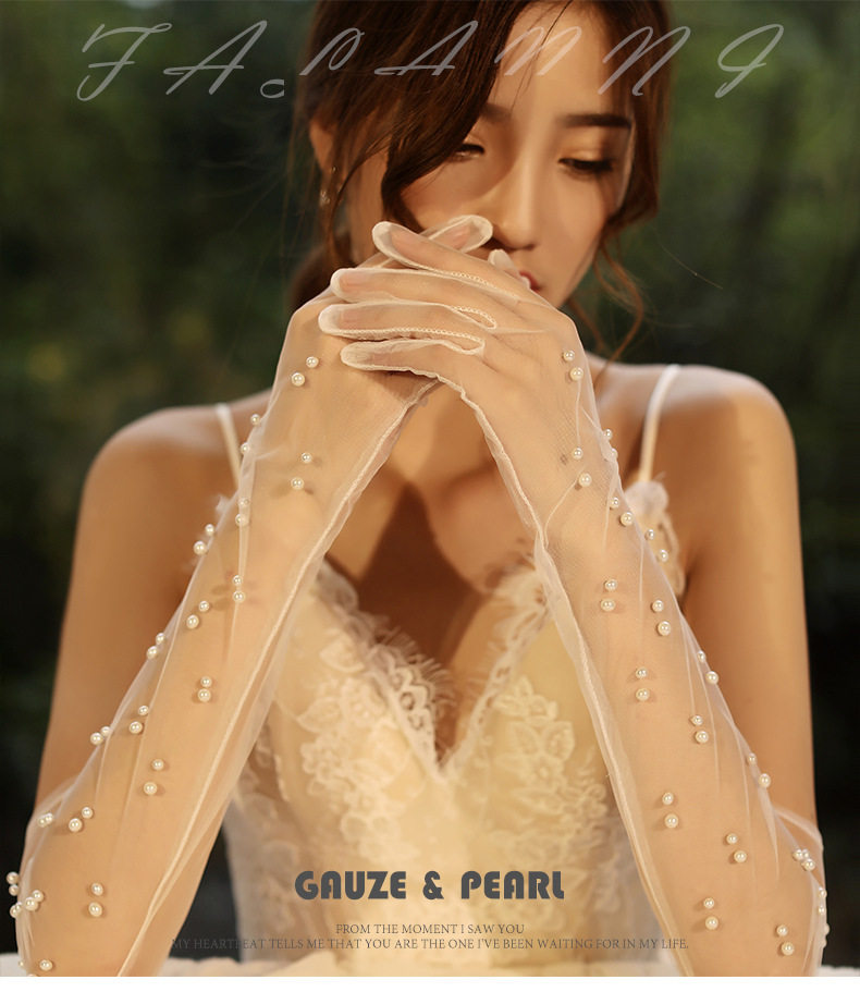新娘结婚礼服冬天露指袖 加长薄款 套珍珠 新款 婚纱手套女士2020冬季