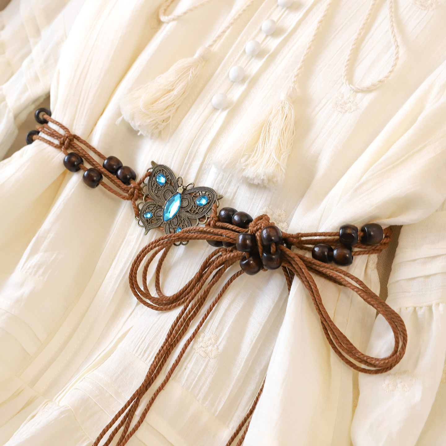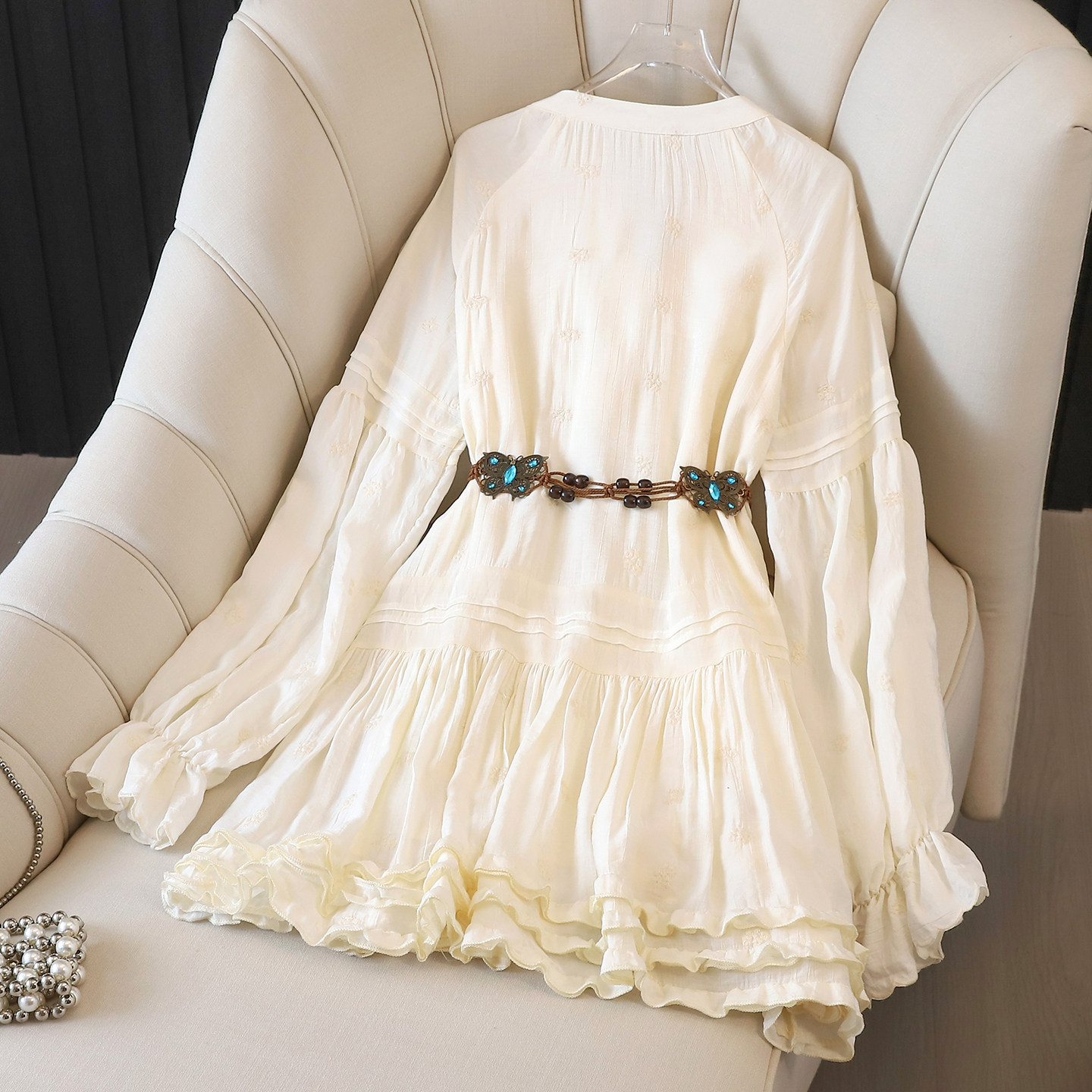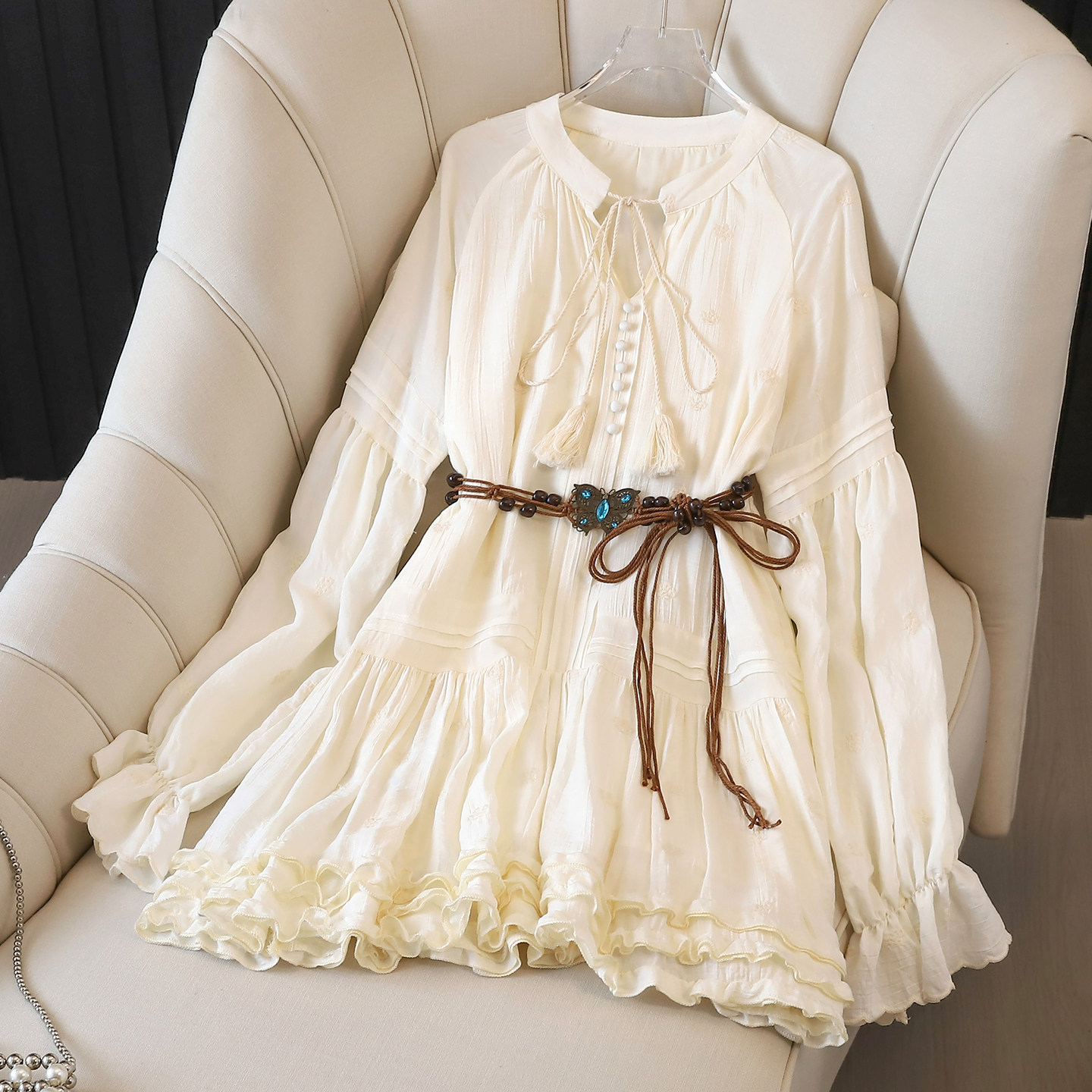 新款 拉夏贝尔波西米亚长袖 连衣裙女设计感收腰系带度假风短裙春季