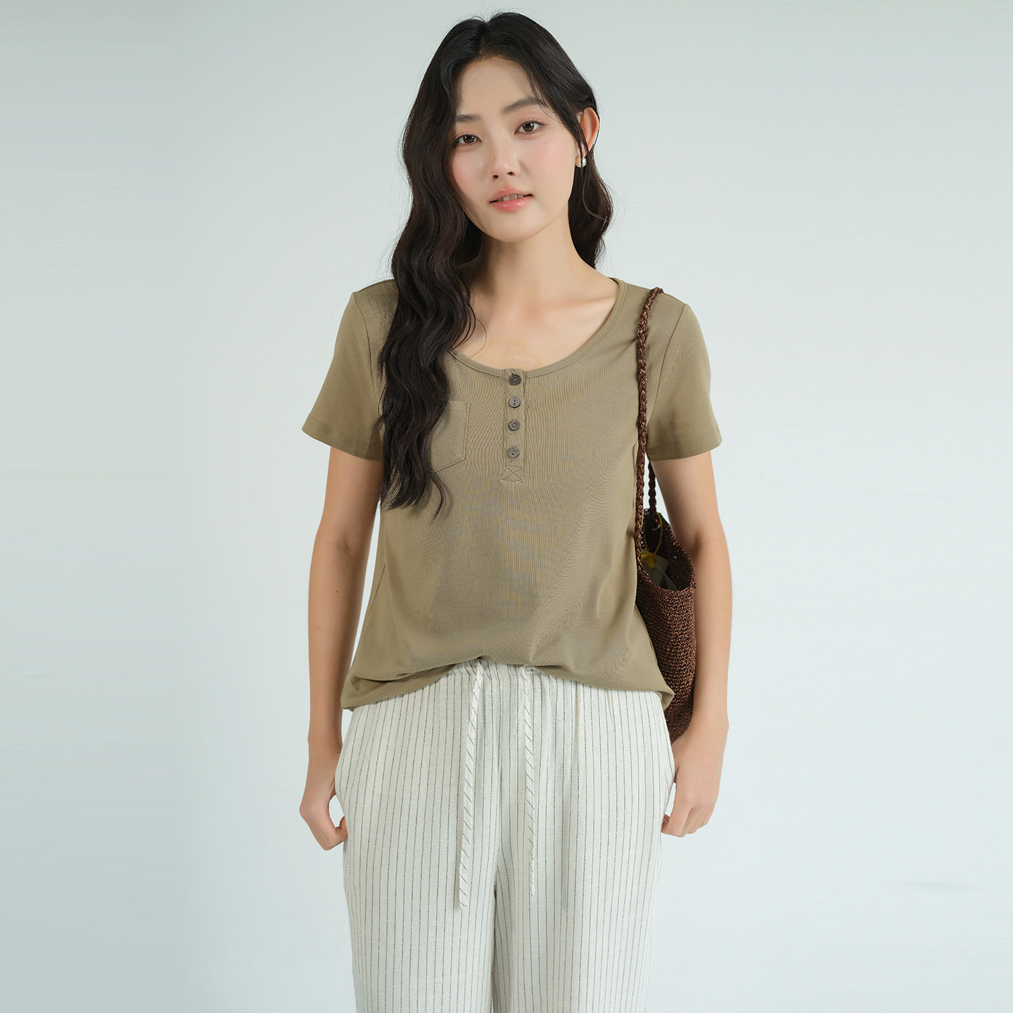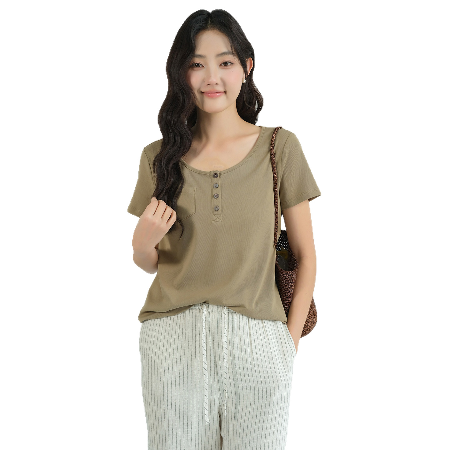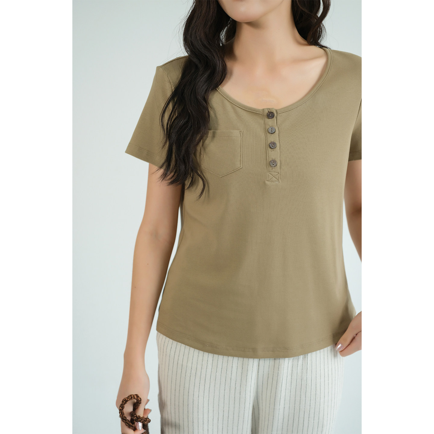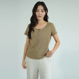 新款 胖MM弹力半开领T恤2026夏装 40支奥代尔棉上衣 女装 蓝若水大码
