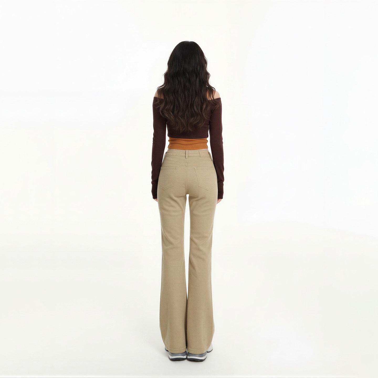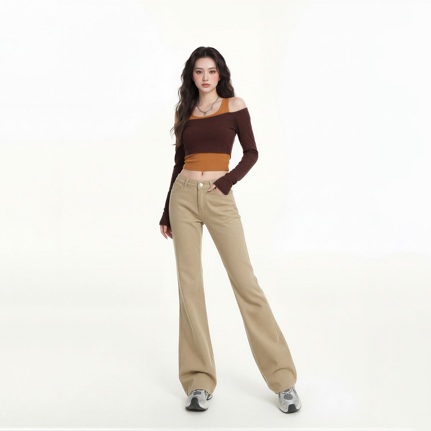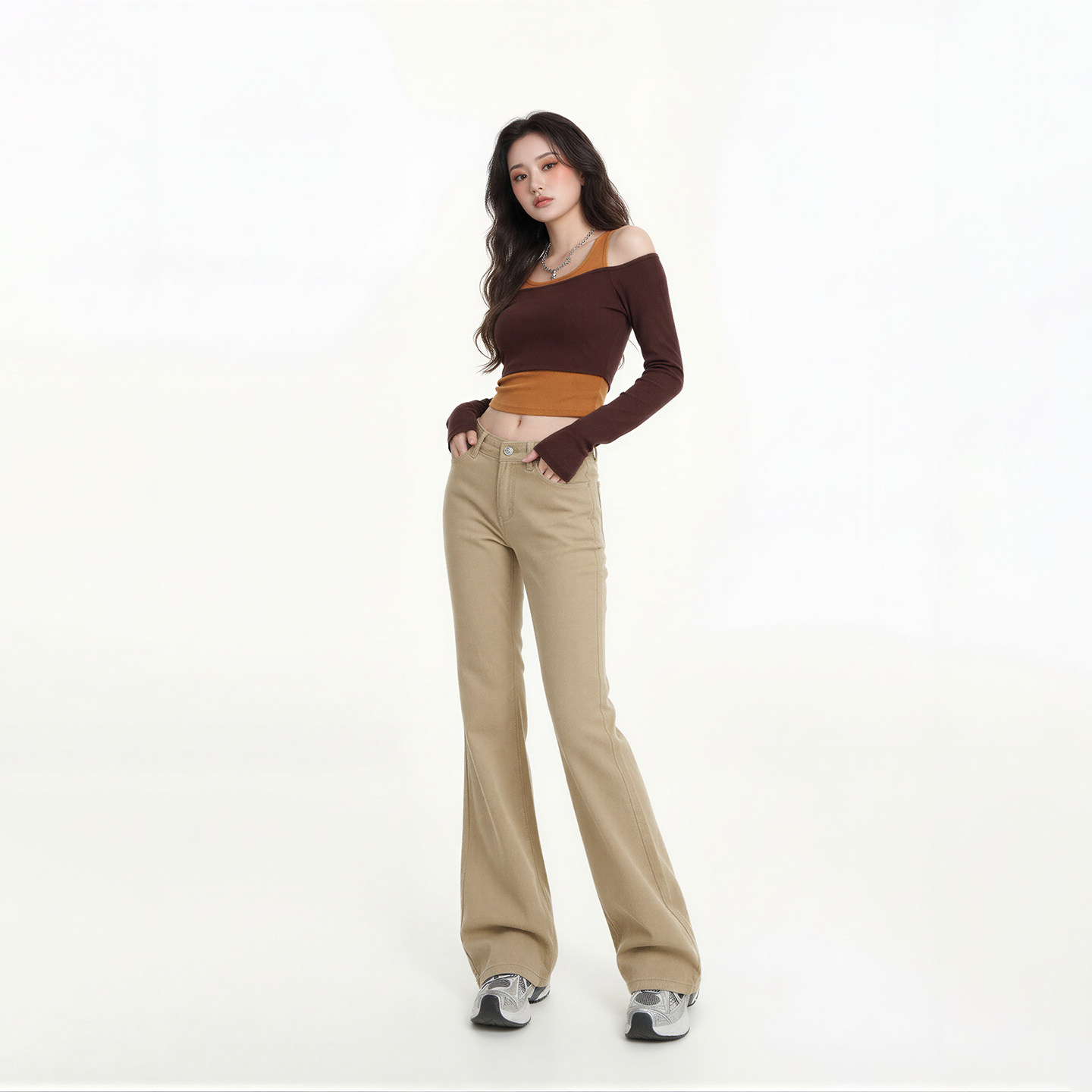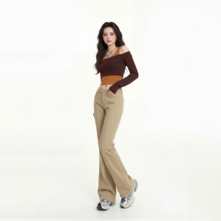 长裤 艾格美式 拖地款 辣妹低腰垂感小个子马蹄裤 卡其色微喇牛仔裤