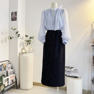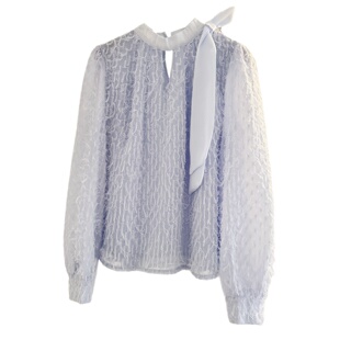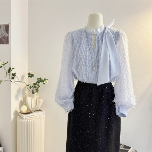 女2025秋设计感气质小衫 法式 衬衫 飘带长袖 上衣 立领植绒流苏雪纺衫