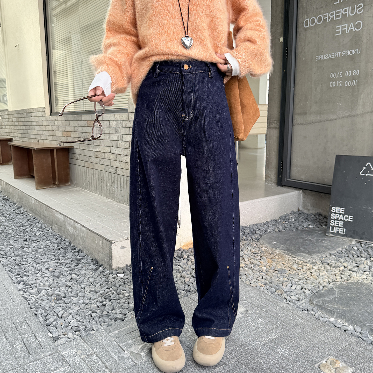 女秋冬直筒宽松显瘦拖地阔腿裤 深蓝色弯刀加绒牛仔裤 型 实力派裤