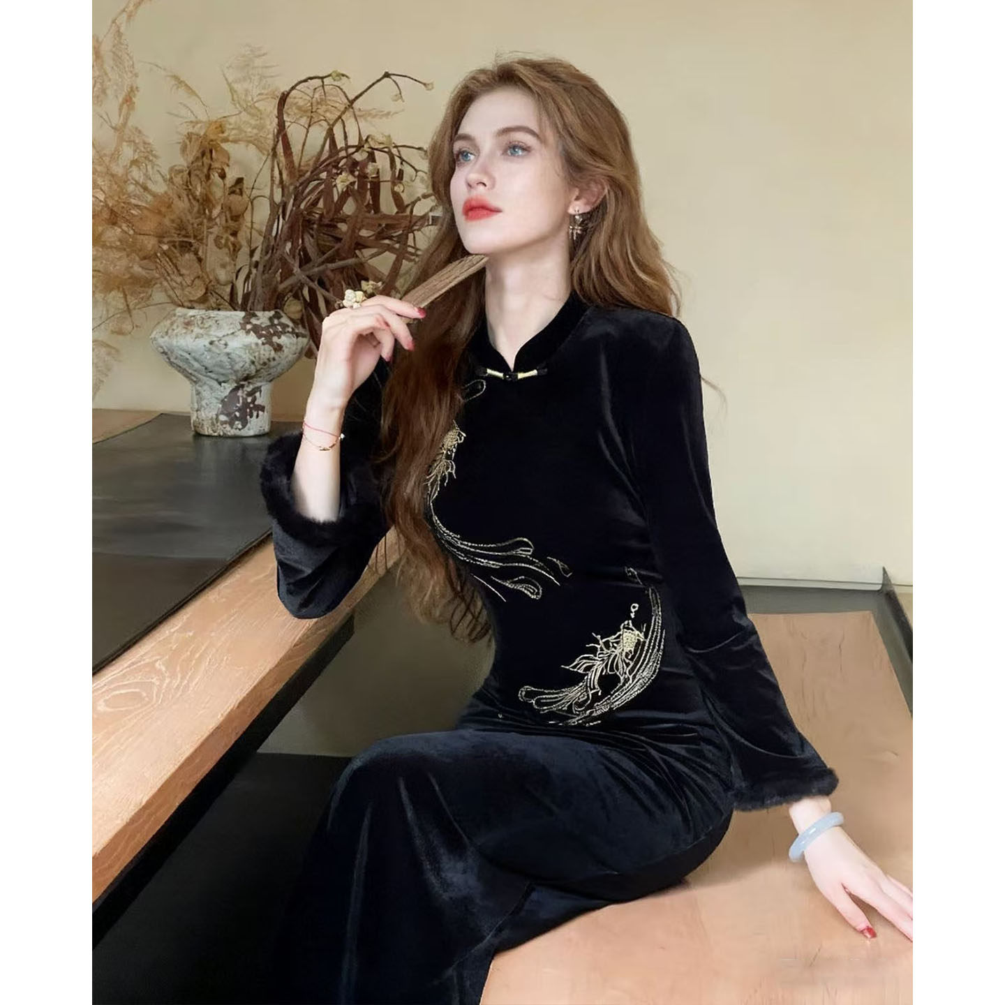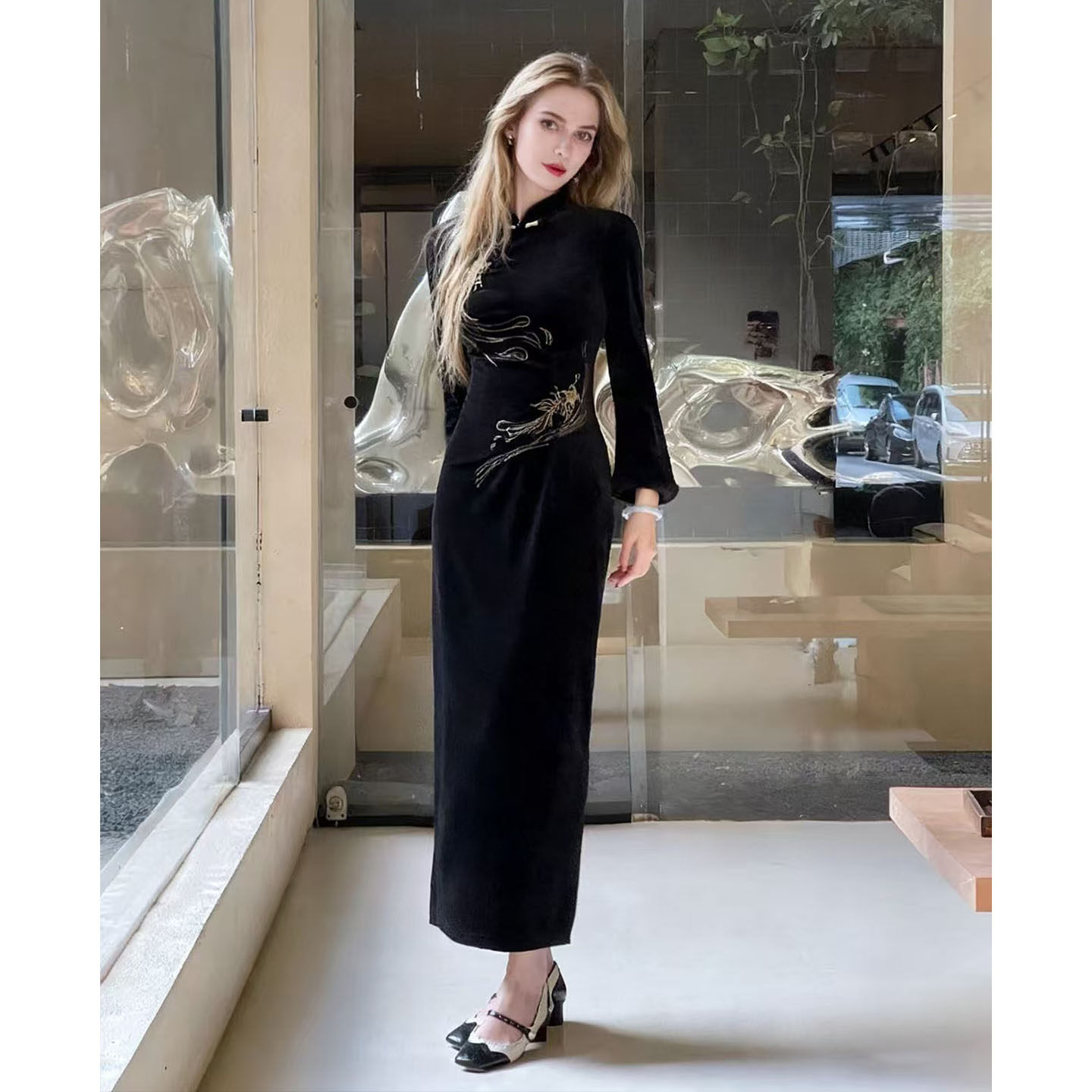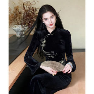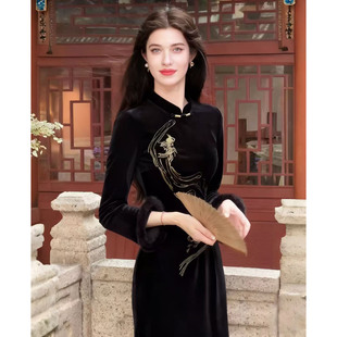 连衣裙 加绒加厚刺绣改良气质长袖 凌茜新中式 黑色丝绒旗袍秋冬新款